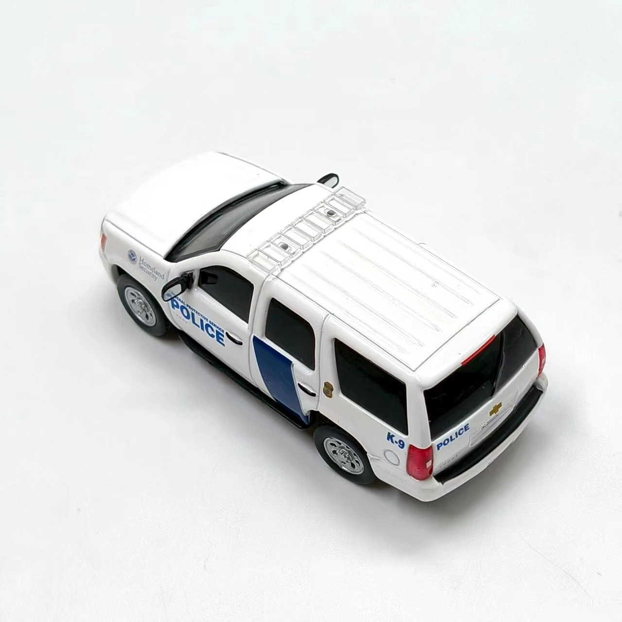 Imagine adding this highly detailed 1:64 scale diecast Tahoe SUV to your collection, measuring approximately 7 cm in length. Crafted from alloy and plastic, it features a sleek white body accented with black door handles, side mirrors, and hood, along with realistic molded headlights, taillights, and front grille. The vehicle proudly displays markings of the Federal Protective Service, including a blue shield emblem, “FEDERAL PROTECTIVE SERVICE POLICE” text on the sides, and a “K-9” label at the rear, enhancing its authenticity. The tinted black windows and silver rims on the wheels complete its polished, collector-quality appearance—perfect for enthusiasts and adult collectors seeking realism and craftsmanship.