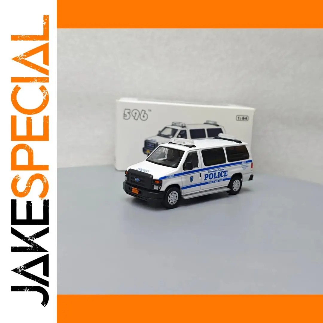 Imagine owning this highly detailed diecast replica of a Ford E-Series van used by the New York Environmental Police Department. Crafted with precision, this model features a sleek white body accented by bold blue stripes and black decals, capturing the authentic police vehicle look. The transparent windows reveal intricate interior details, including a steering wheel and seats, enhancing realism. The front showcases a black grille and bumper, while the rear is fitted with small red and white taillights. The white emergency light bars on the roof add a vibrant touch. Made primarily from durable metal, this scale model boasts refined proportions and fine detailing, making it a stunning display piece for collectors and enthusiasts alike.