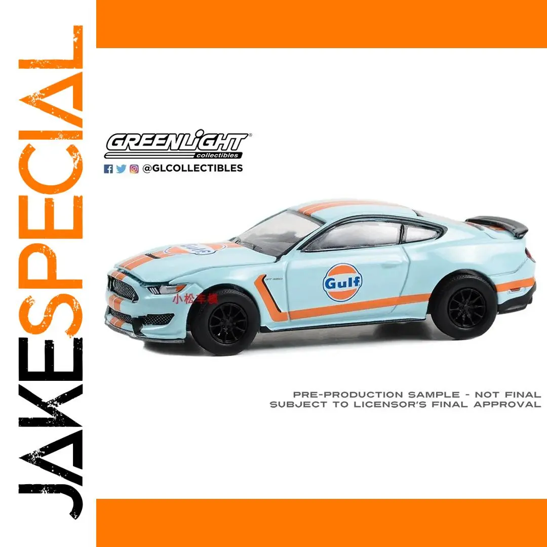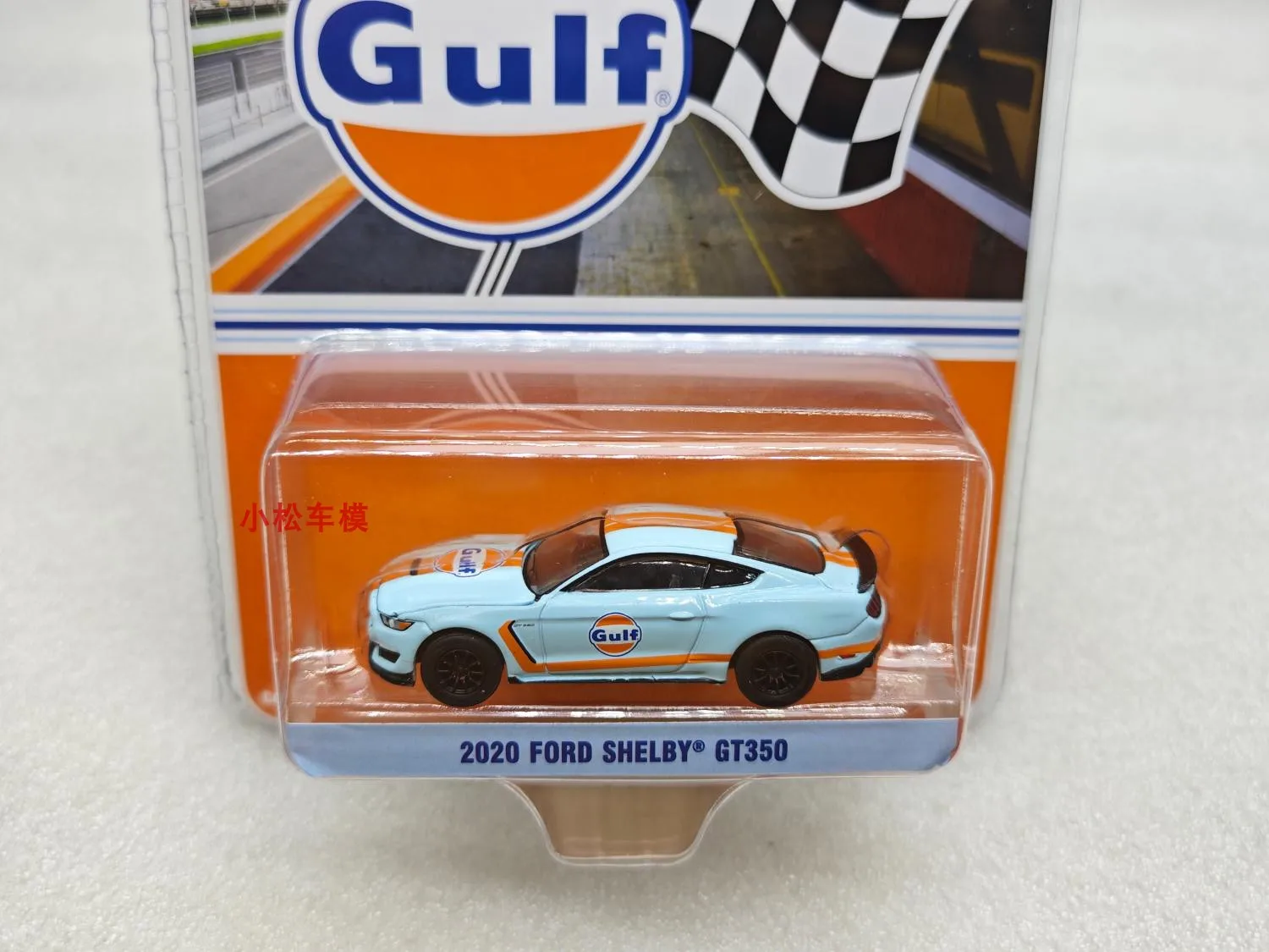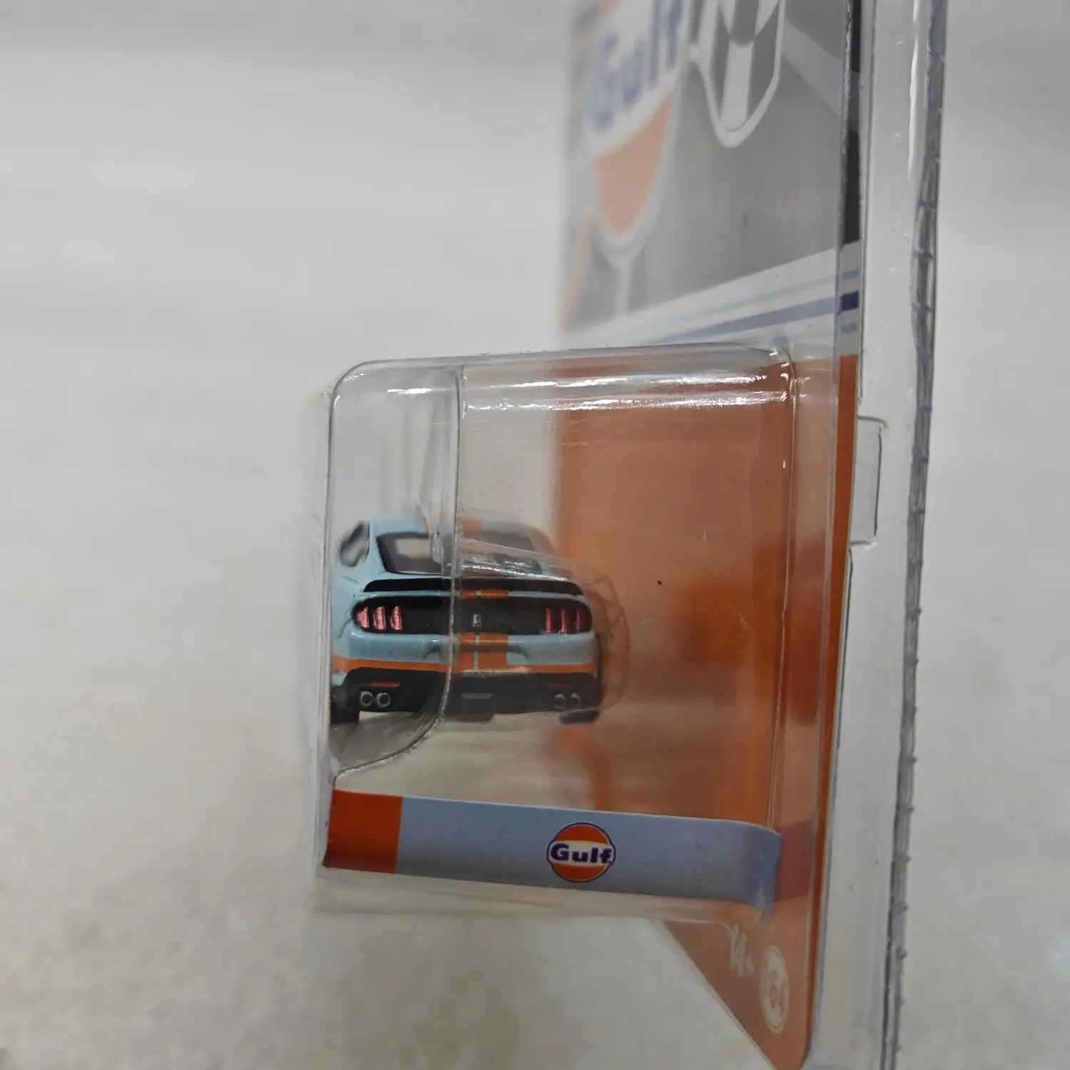 This highly detailed 1:64 scale model of the Ford Mustang GT350 captures the essence of racing with its vibrant light blue color and iconic Gulf Oil branding. The deep orange and white racing stripes add a striking contrast that highlights the model's sleek design. Every aspect, from the meticulously crafted headlights and taillights to the sporty black wheels, reflects an impressive attention to detail. The Gulf logo prominently displayed on the hood and doors enhances its authentic racing feel, making this model a must-have for collectors and enthusiasts of classic cars. Whether for display or as part of a collection, it embodies the spirit of speed and style.