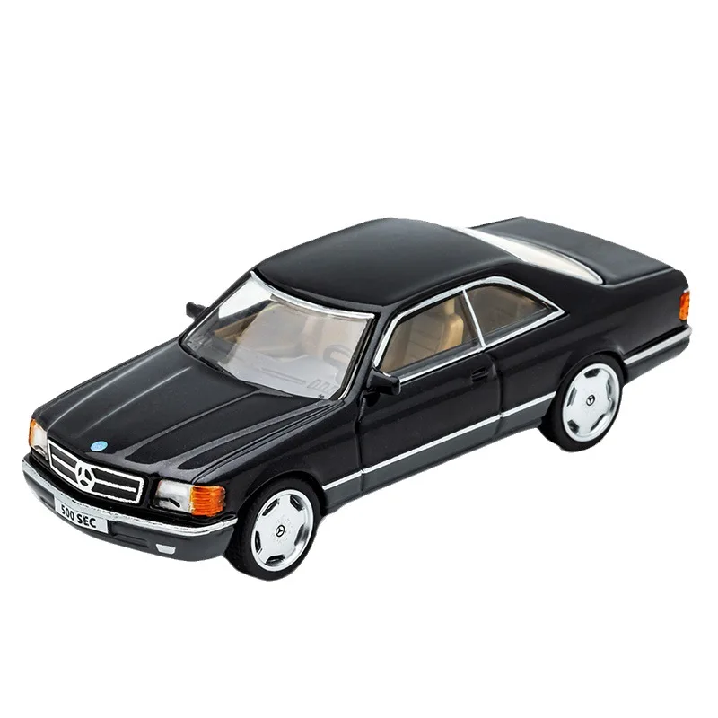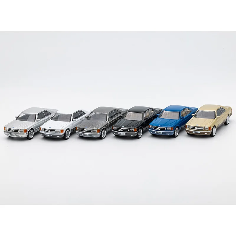 Step into the world of luxury with this beautifully crafted 1:64 scale Mercedes-Benz 500 SEC miniature. Made from high-quality die-cast metal, this model captures the elegance and precision of the original vehicle. Its sleek, metallic finish highlights the aerodynamic curves of the classic coupe silhouette, from the angular contours to the gently sloped rear window. Each replica features detailed front grilles with the Mercedes-Benz emblem, rectangular headlights with orange turn signals, and transparent windows revealing subtle interior hints. The wheels sport white rims and black tires, enhancing the realistic appeal. Perfect for display or as a collectible, this model brings a touch of sophistication and automotive excellence to your collection.