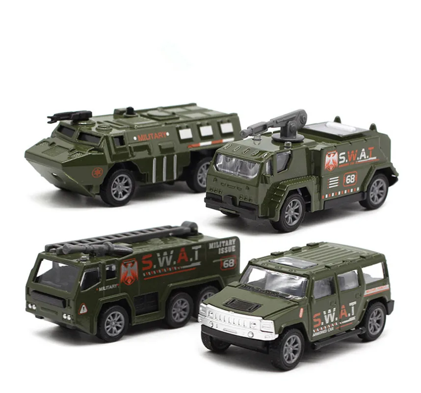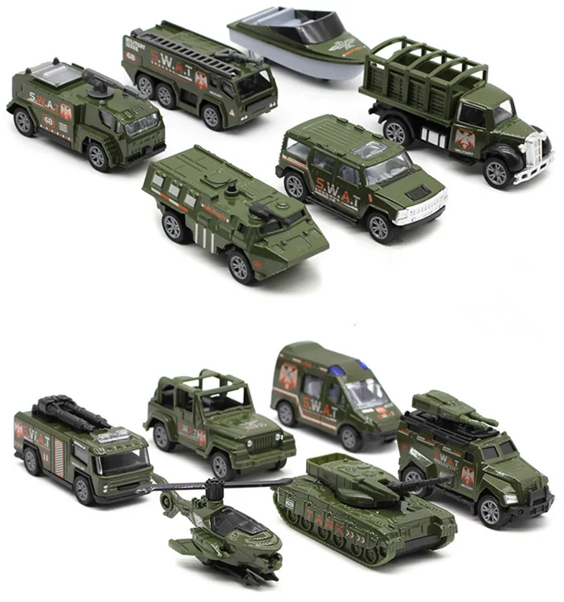 This 1:64 scale military-style car model set features six meticulously crafted vehicles, each approximately 8 cm in length. Made from durable zinc alloy, plastic, and rubber, the diecast construction ensures a sturdy feel. The collection includes a SWAT vehicle with striking orange highlights, a compact military Jeep, a detailed tank, a helicopter with rotor blades, a transport truck for troop carrying, and a military-style boat, all presented in an appealing green color scheme. This original gift packaging makes it an ideal choice for collectors and enthusiasts alike.