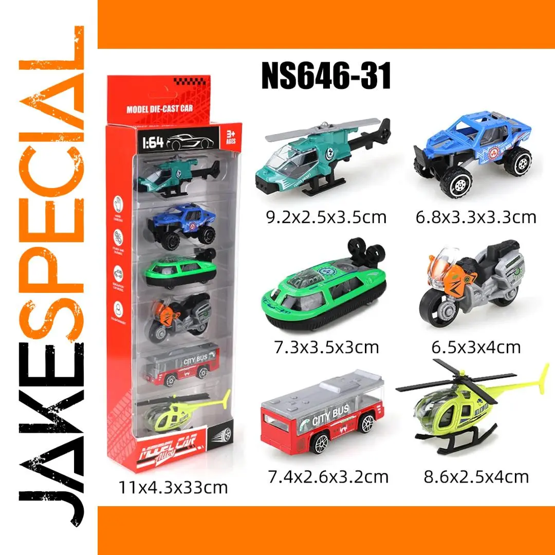 Bring home this captivating set of six miniature diecast vehicles, perfect for collectors and enthusiasts alike. Crafted from durable metal, each vehicle offers a realistic and vibrant appearance, showcasing intricate details and sleek finishes. The collection includes a variety of vehicles such as a helicopter, off-road car, drone, scooter, bus, and hovercraft, all designed with bold colors like blue, green, orange, and red. These compact models are ideal for display, play, or gifting. Their authentic detailing and high-quality construction make them a standout addition to any collection. Whether you're a seasoned collector or a passionate hobbyist, this set provides endless fun and visual appeal. Enjoy imagining dynamic scenes and creating stories with these lively miniature vehicles.