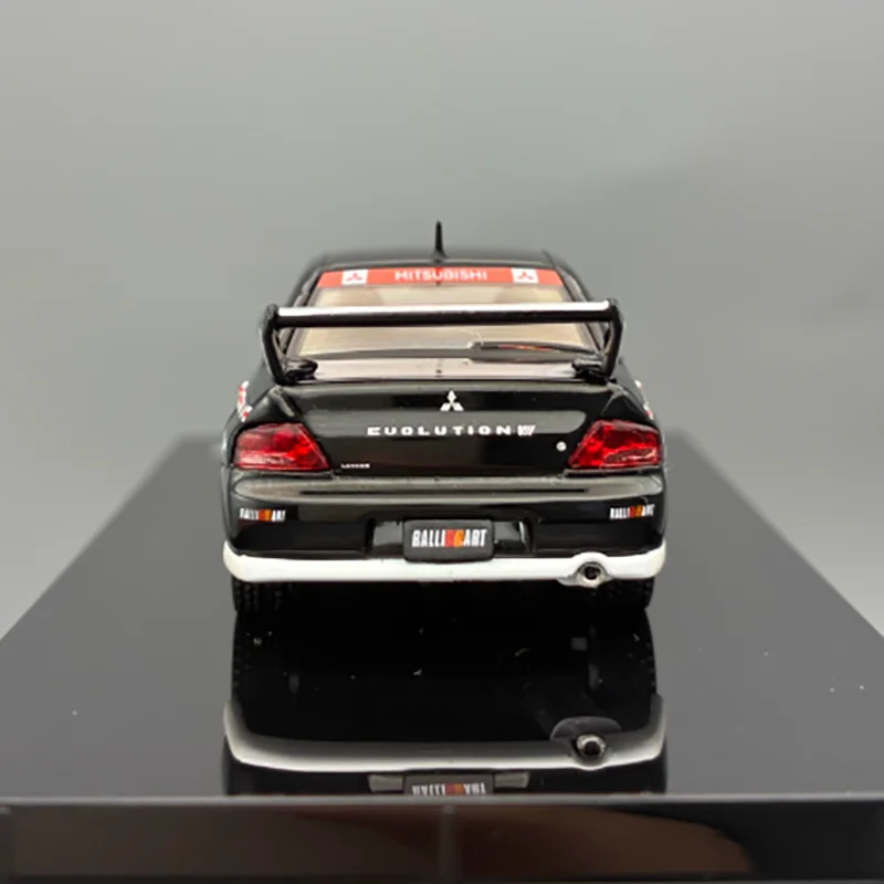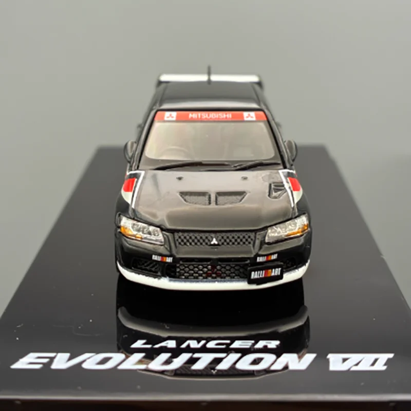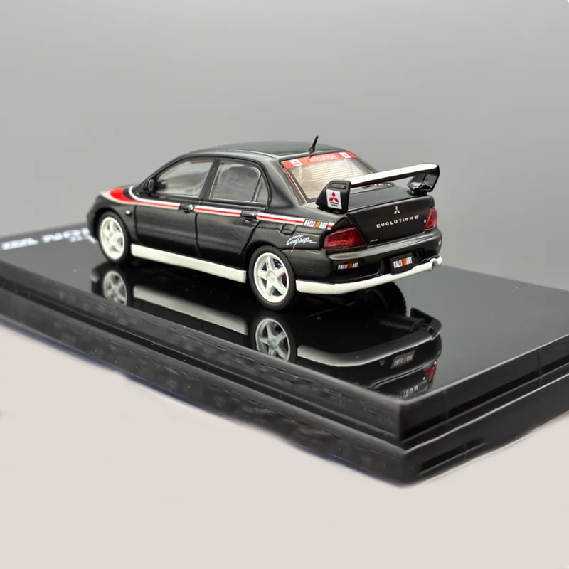 Experience the thrill of the iconic EVO VII with this highly detailed 1:64 scale diecast alloy and plastic model, perfect for display and collection by adult enthusiasts. Measuring approximately 1/64 in scale with slight dimensional deviations, it features a sleek black finish accented by realistic silver-colored multi-spoke wheels and low-profile tires. The model showcases a sporty silhouette, clear windows revealing detailed interiors, a prominent rear wing spoiler, sculpted front grille, aerodynamic side lines, and subtle racing decals on the roof and sides, all crafted for realism and aesthetic appeal. Made from durable alloy and plastic, this collectible is ideal for sophisticated display and admiration.
