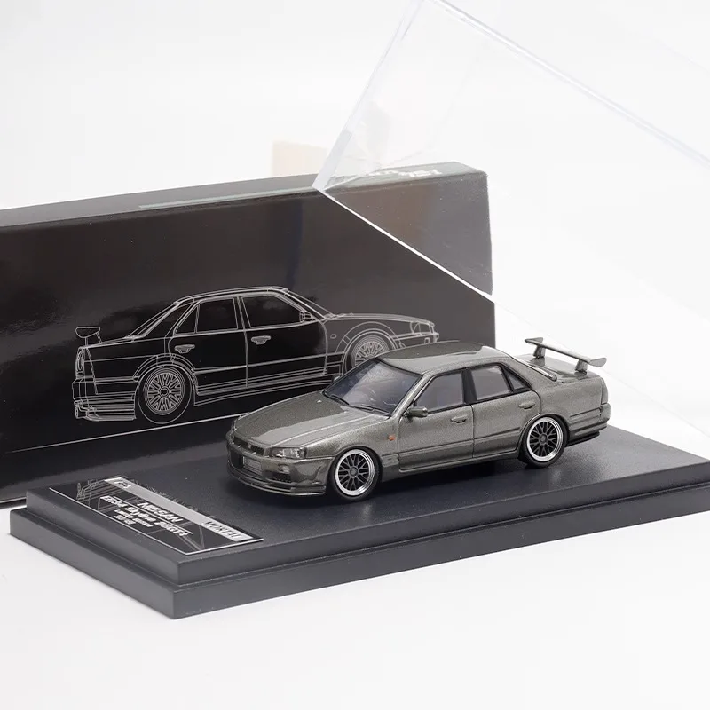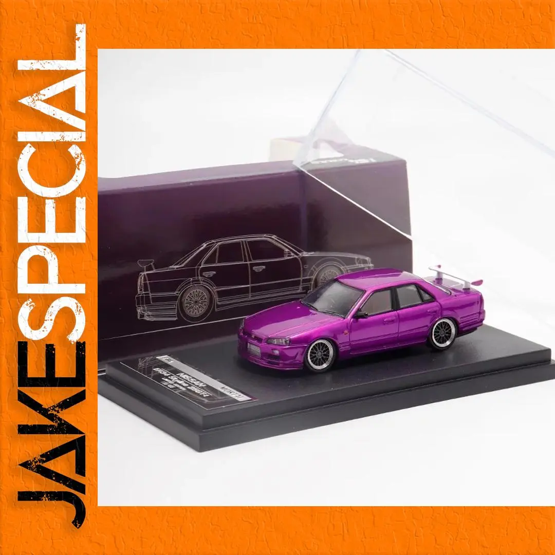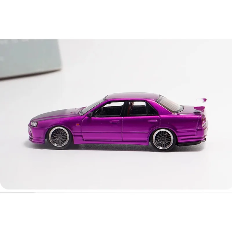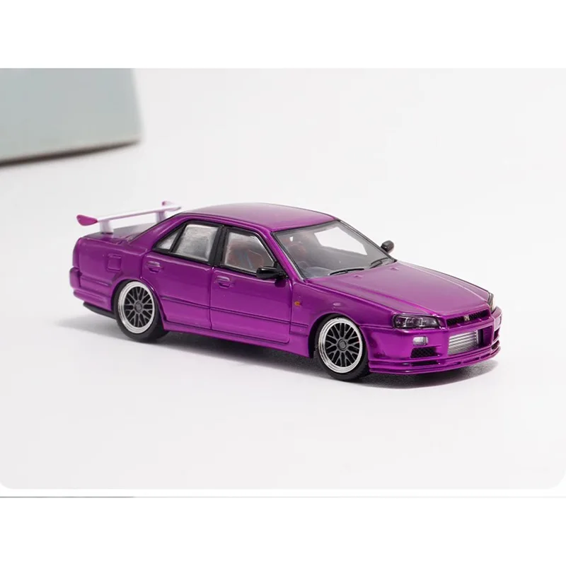 Immerse yourself in the elegance of this meticulously crafted 1:64 scale Nissan GTR ER34 Skyline 25GT-T alloy model. Its vivid metallic purple finish captures the sporty essence and aggressive stance of the original vehicle, making it a perfect addition to any collection. The glossy, high-quality exterior highlights intricate details, from the sleek contours of the hood to the prominent front bumper with an integrated grille. The model features realistic headlights, sculpted side panels with subtle body lines, and small side mirrors that enhance its authentic appearance. The large rear spoiler adds a performance-inspired touch, while multi-spoke silver wheels with low-profile tires complete its sporty look. An elegant display piece that embodies craftsmanship and style.