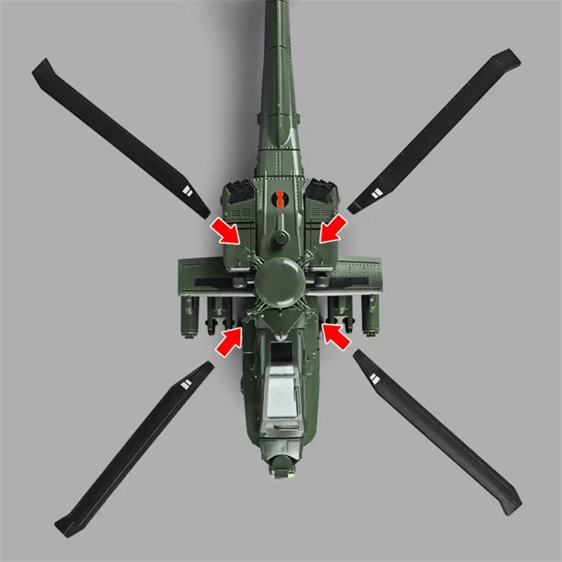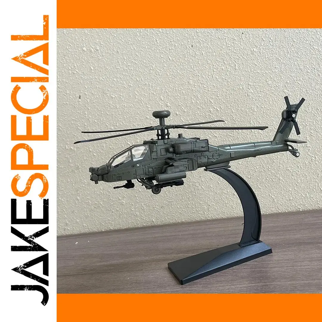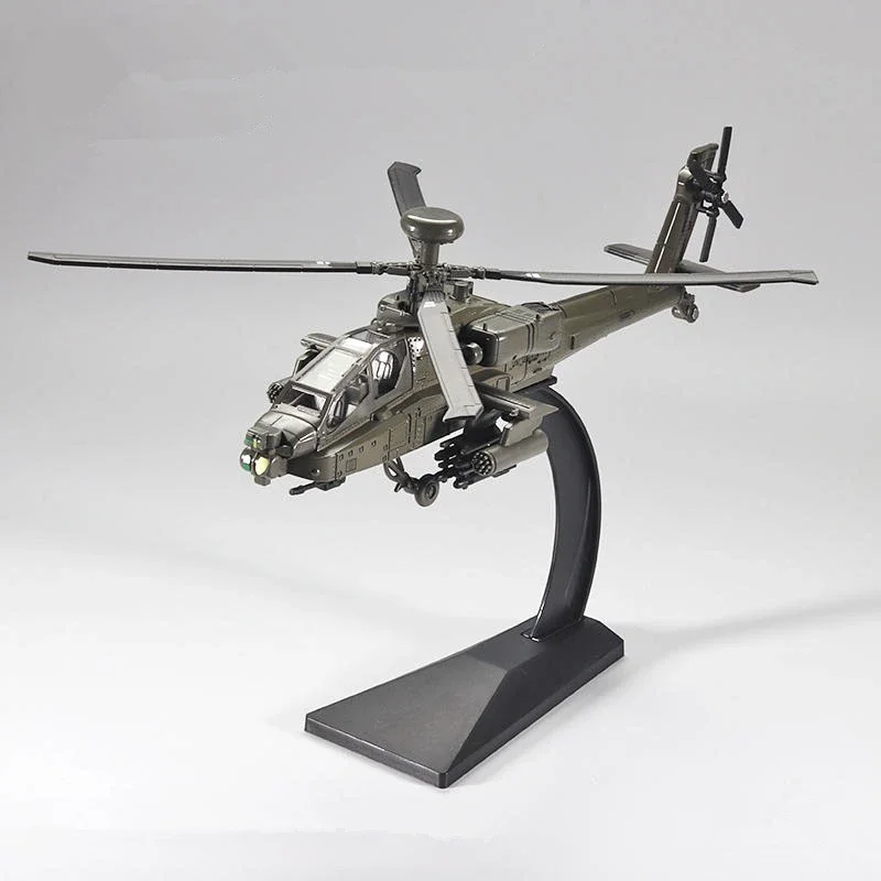 Discover this highly detailed 1:64 scale diecast model of the AH-64 Apache utility helicopter, crafted from alloy and plastic with a sleek military gray finish. This authentic replica features finely etched panel lines, antennas, sensors, and weapon mounts, highlighting its realism. The transparent cockpit canopy reveals meticulous interior details. The model is mounted on a modern black stand, creating a dynamic hovering appearance that captures the helicopter in motion. Designed as a collectible for enthusiasts, it includes sound and light features to enhance display appeal, perfect for those who appreciate precision craftsmanship and military realism. Suitable for ages 14 and above.