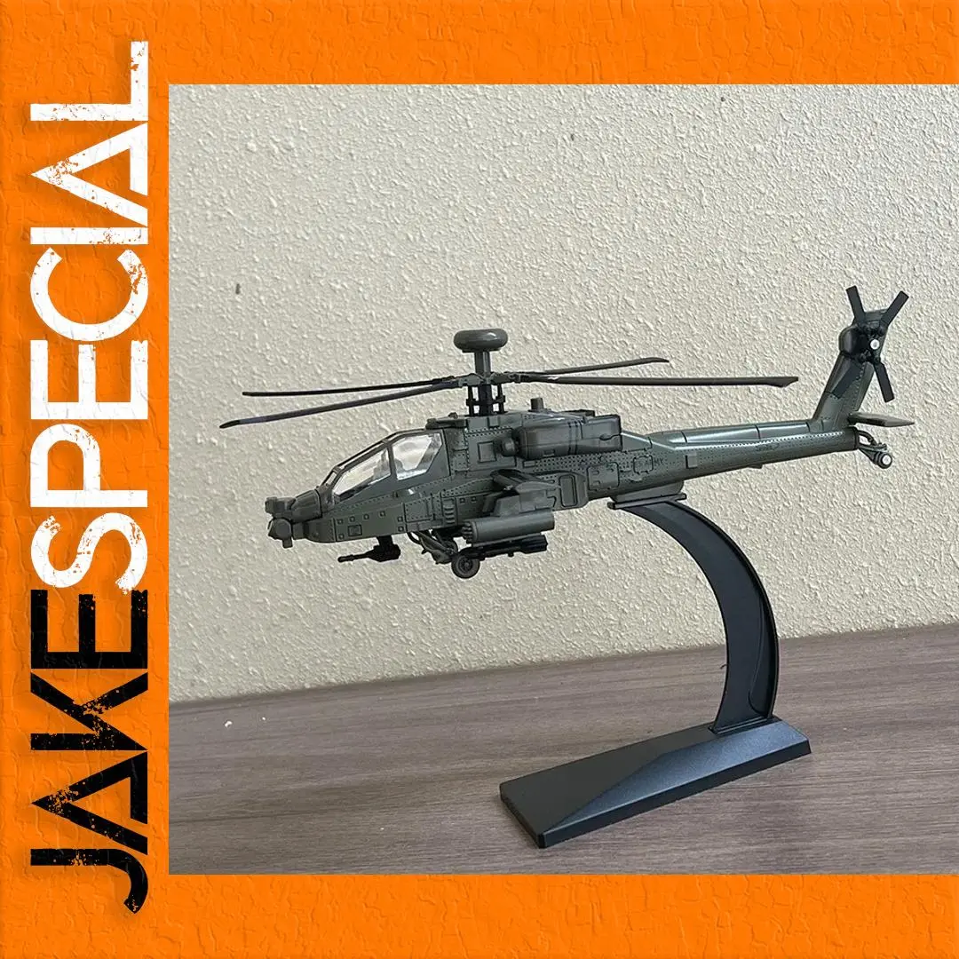 The AH-64 Apache helicopter model is a highly detailed diecast replica constructed from alloy and plastic, showcasing a scale of 1:64. Its realistic military green finish is complemented by a streamlined fuselage with visible panel lines, a transparent cockpit with finely molded edges, and two black rotor blades. The model features intricate details like simulated weapons systems, including molded missile pods, and a distinct tail rotor design. It is elegantly mounted on a sturdy black display stand, allowing it to appear as if hovering. This non-electric model does not require batteries, making it perfect for display.