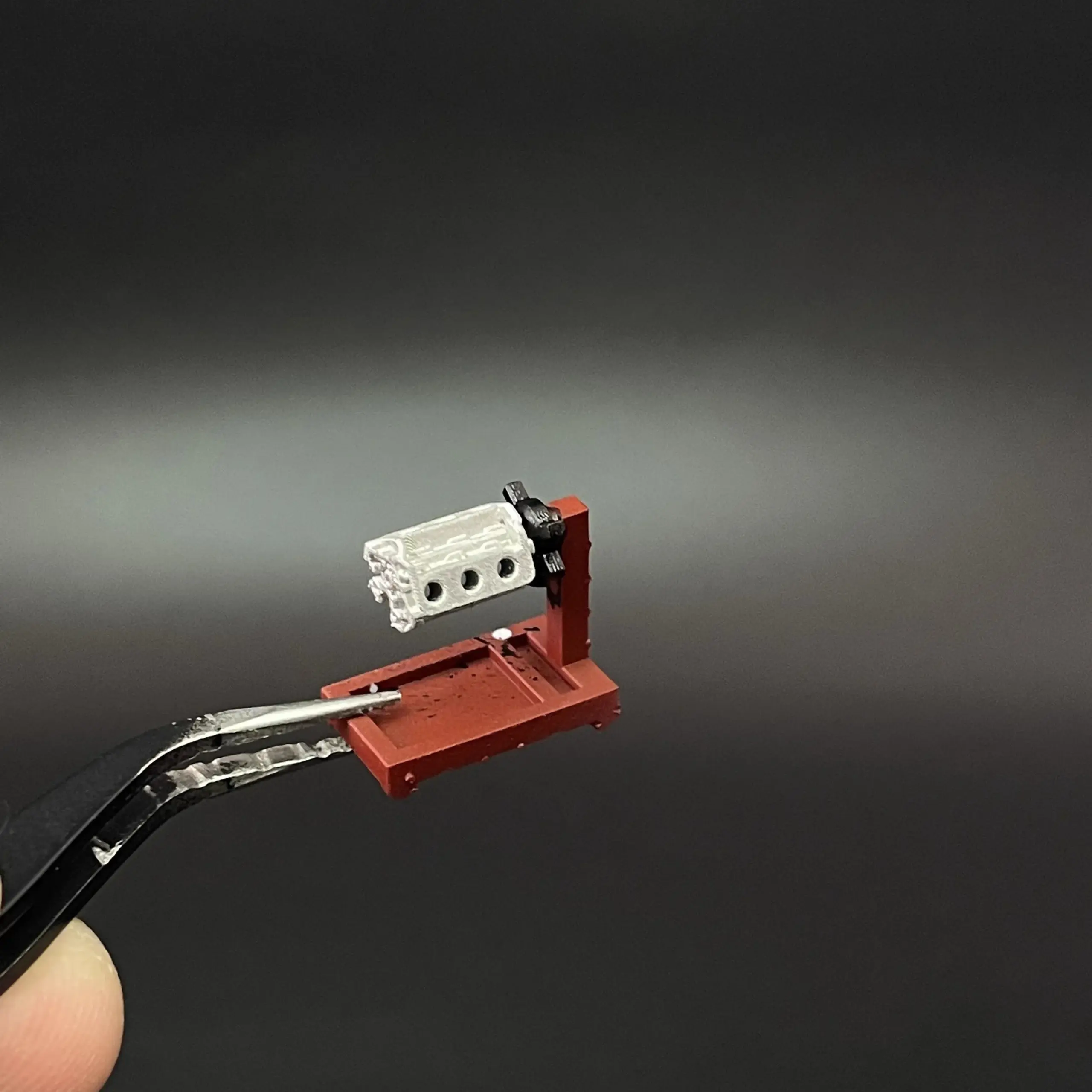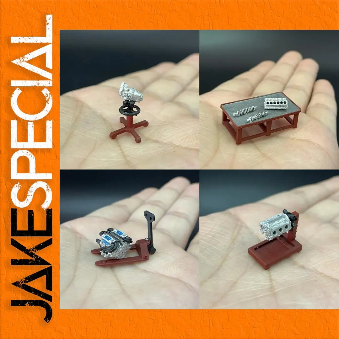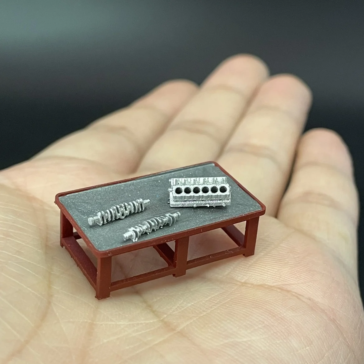 The Diorama 1:64 Auto Repair Table Model merges intricate design with functional aesthetics, perfect for car enthusiasts. Crafted from high-quality resin, this collectible showcases a silvery-textured surface on its rectangular table complemented by a reddish-brown base. Detailed miniature tools create a realistic atmosphere, while the meticulously hand-painted finish highlights every component. The engine stands being supported by a sturdy black engine stand adds character, and another engine on a vibrant red dolly enhances your display. This versatile piece serves beautifully for miniature photography, home decoration, and car model matching.