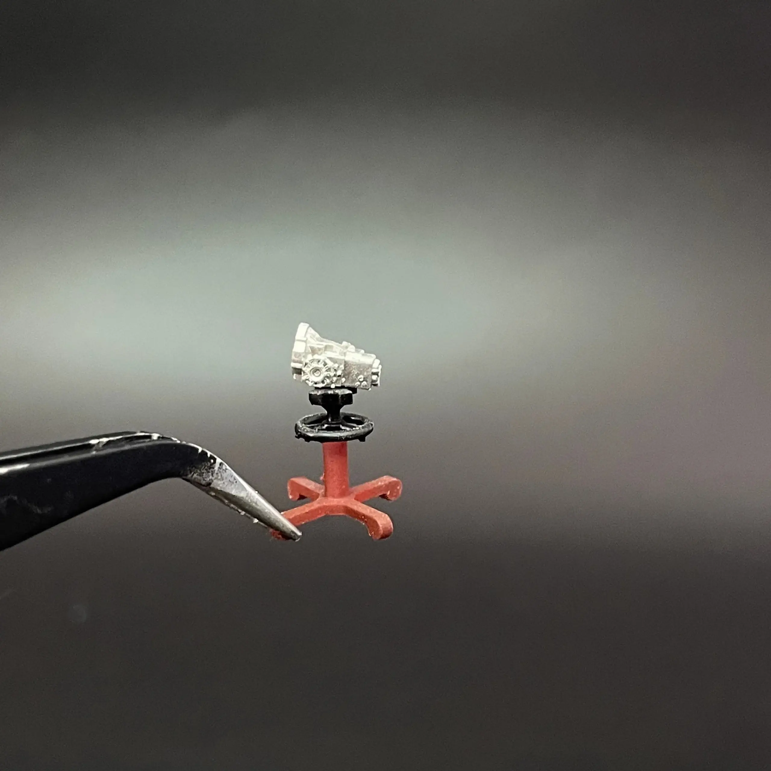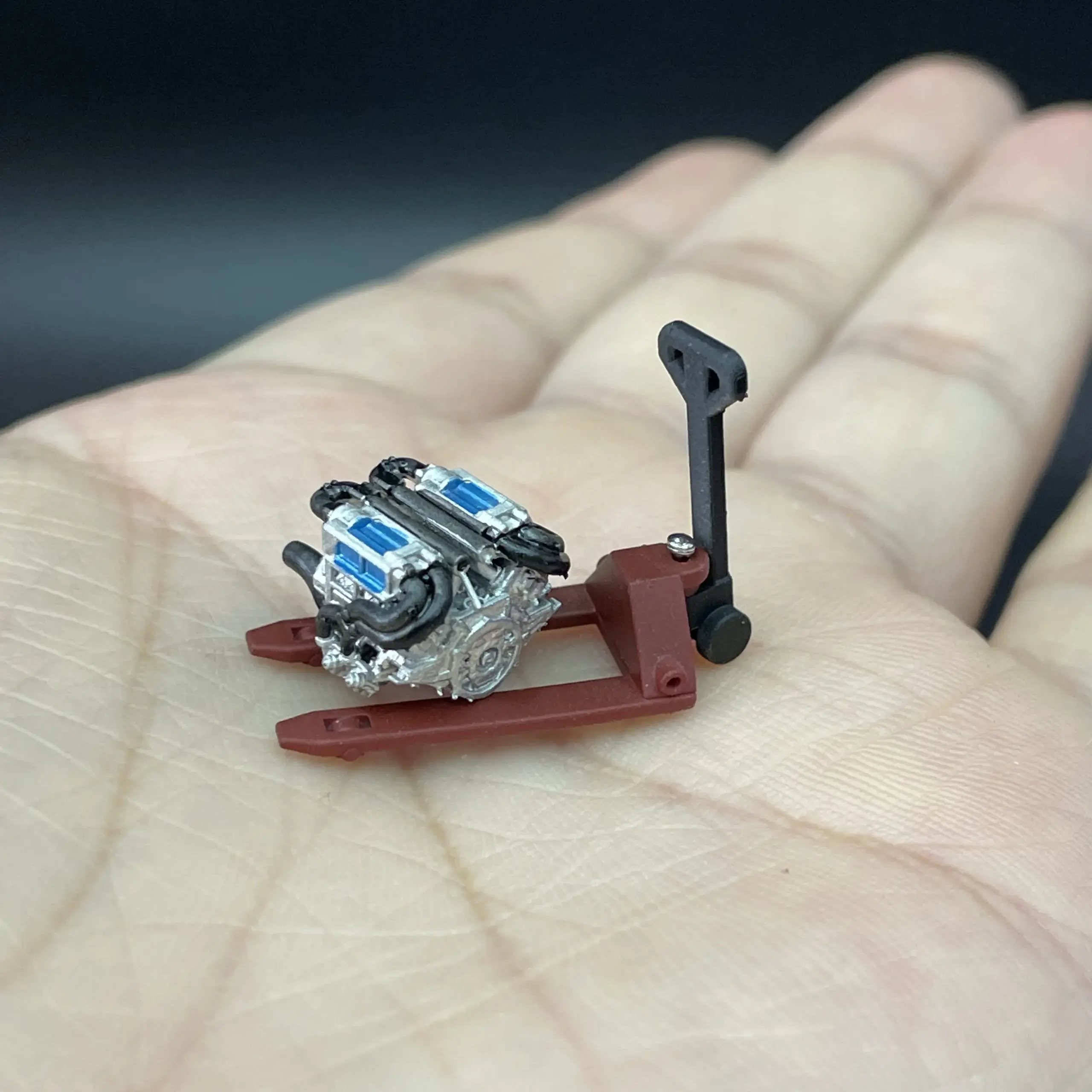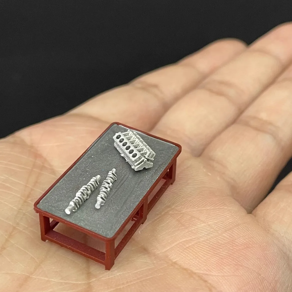 The Diorama 1:64 Auto Repair Table Model merges intricate design with functional aesthetics, perfect for car enthusiasts. Crafted from high-quality resin, this collectible showcases a silvery-textured surface on its rectangular table complemented by a reddish-brown base. Detailed miniature tools create a realistic atmosphere, while the meticulously hand-painted finish highlights every component. The engine stands being supported by a sturdy black engine stand adds character, and another engine on a vibrant red dolly enhances your display. This versatile piece serves beautifully for miniature photography, home decoration, and car model matching.