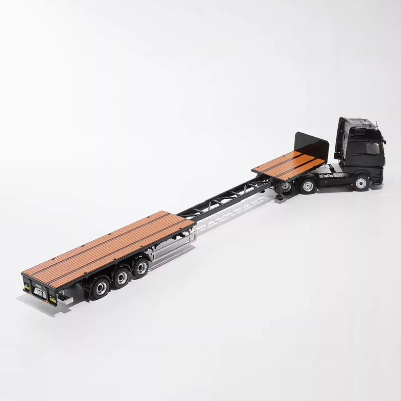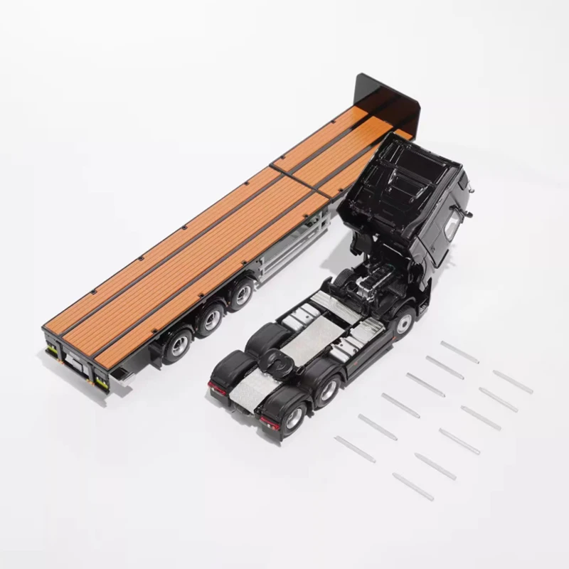 Experience the realism of this meticulously crafted diecast model featuring a modern, aerodynamic truck with a three-axle scalable trailer. Made from durable alloy and high-quality plastic, it showcases vibrant colors like glossy black, vivid blue, or white with red accents, perfect for collectors and enthusiasts. The flatbed trailer with textured surfaces and detailed wheels adds authentic appeal, replicating real cargo surfaces. Around 1:64 scale, this model measures precisely, with slight manual measurement variations. Designed solely for display and collection, it offers a sophisticated, realistic look that enhances any collection or space, capturing the essence of contemporary freight transportation.