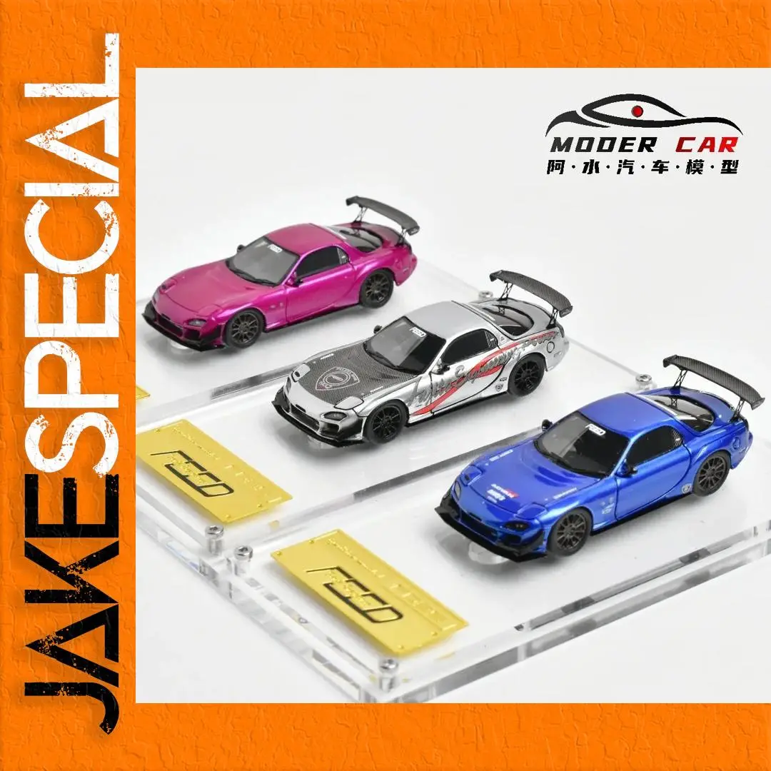 Experience the stunning collection of 1:64 scale diecast model cars featuring the iconic Mazda Feed RX7 FD3S. This set includes three vibrant colors: a striking **purple** model with a low profile and black spoiler, a sleek **silver** car adorned with a carbon fiber hood and a dynamic red and black stripe, and a glossy **blue** variant highlighting the RX7’s signature design with black accents. Each model is crafted from high-quality resin, showcasing intricate details like grills, headlights, and sculpted interiors. Elevate your display with these exquisite pieces, each presented on a clear acrylic base with gold nameplates labeled “FD3D.”