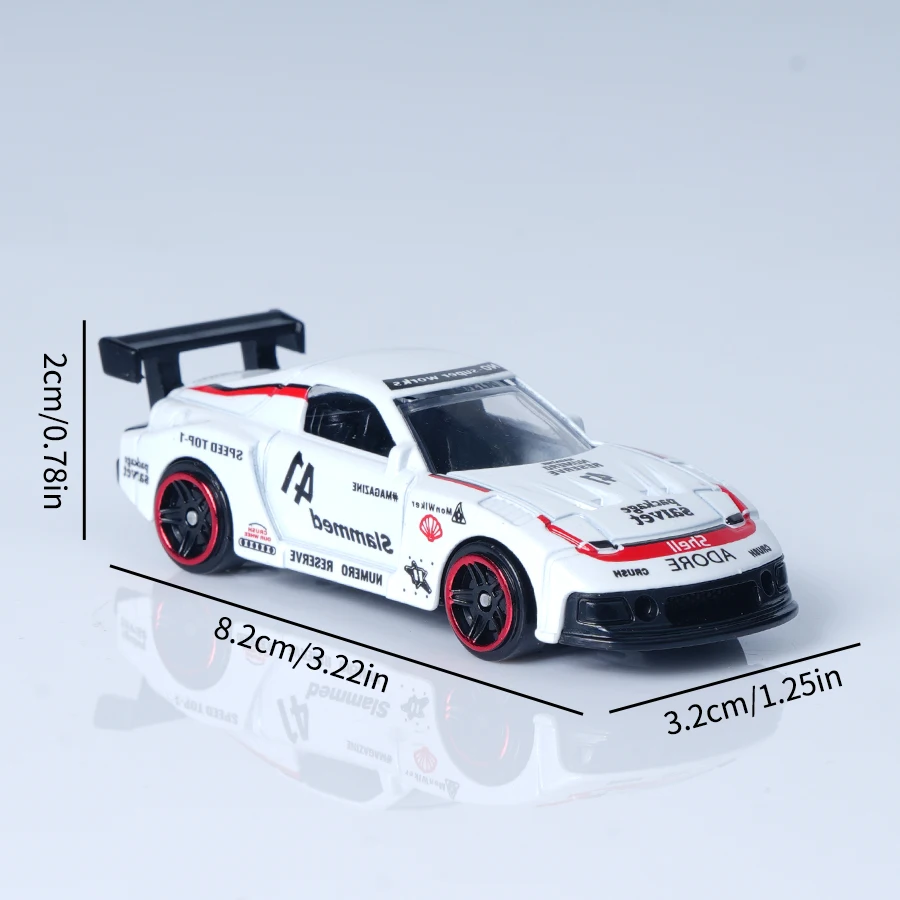 Experience the thrill of racing with this meticulously crafted diecast racing car. Designed at a 1:64 scale, this model captures the sleek, sporty essence of a professional race vehicle with a striking white body accented by vivid red details and black elements. Its aerodynamic design features decals, logos, and racing numbers that evoke high-speed competition. The black front bumper and rear wing spoiler enhance its aggressive look, while the black and red performance tires add authentic detail. Made from durable metal, this model offers both durability and aesthetic appeal. Whether displayed as a collector’s piece or used for imaginative play, this car embodies speed, agility, and style that will excite racing enthusiasts and collectors alike.