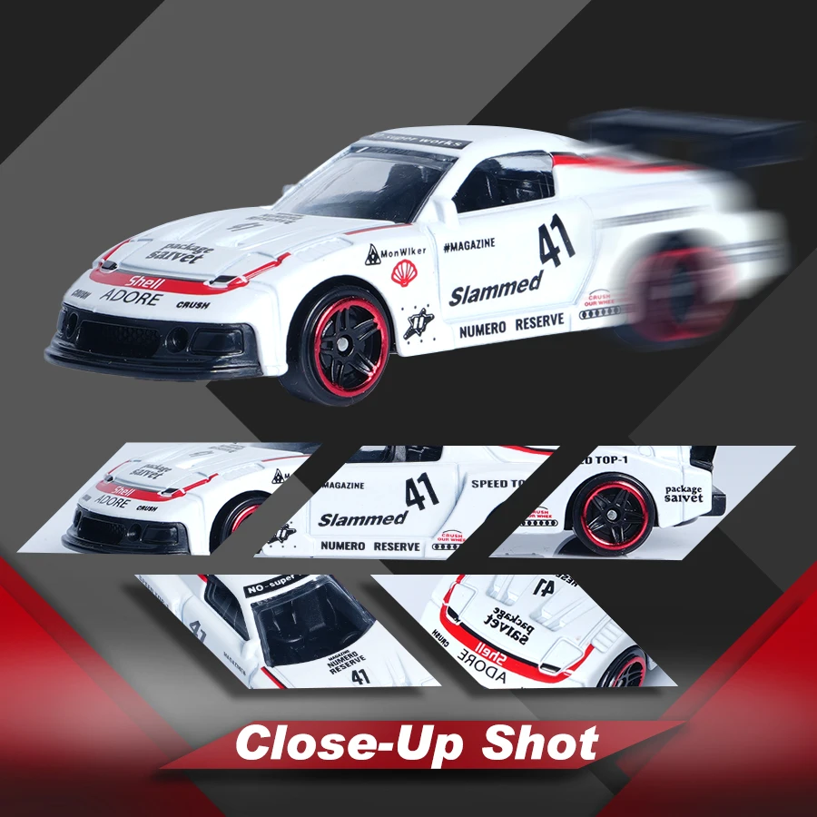 - The aerodynamic features include a black bumper, rear spoiler, racing decals, logos, and the number “41” on the roof, enhancing its authentic high-performance appearance.