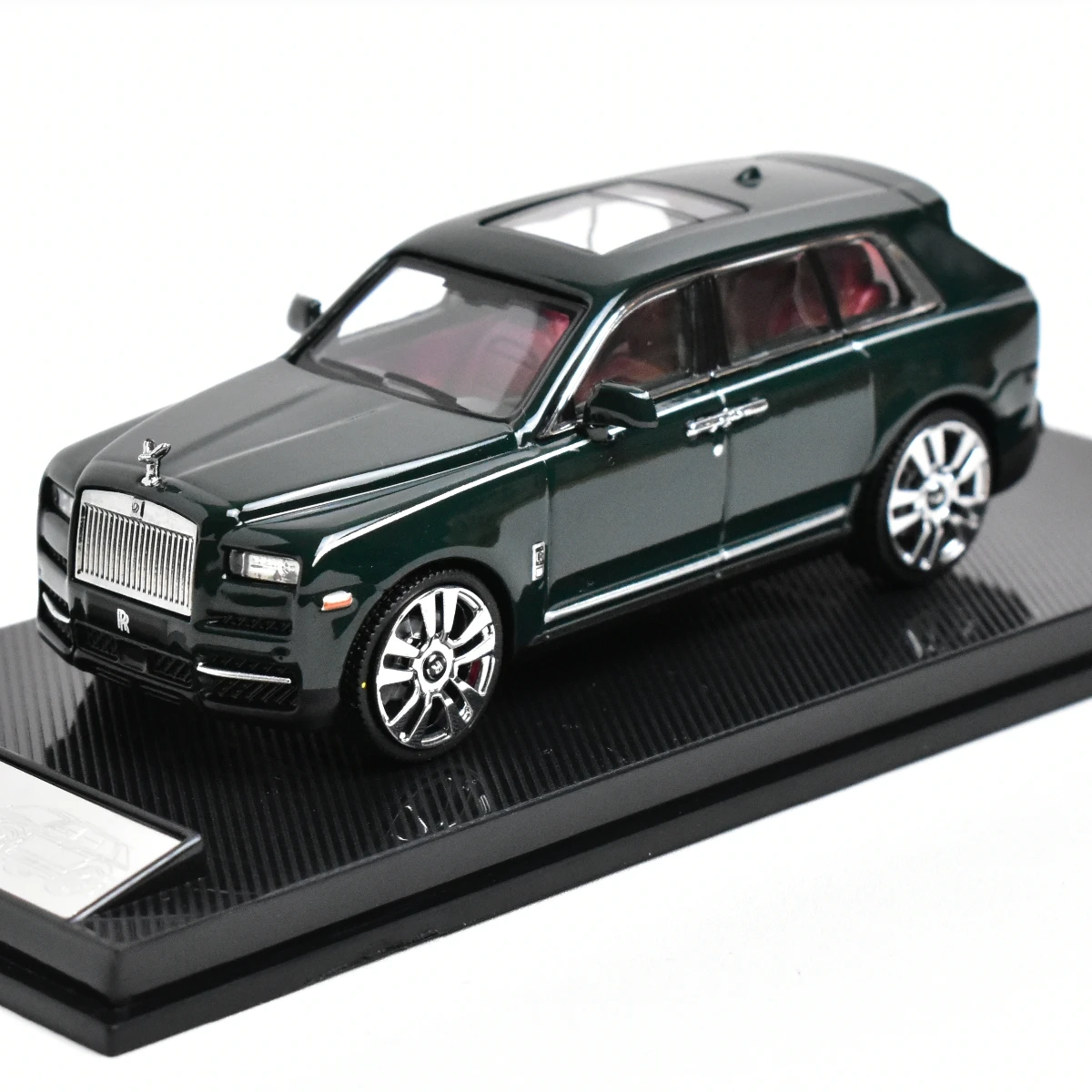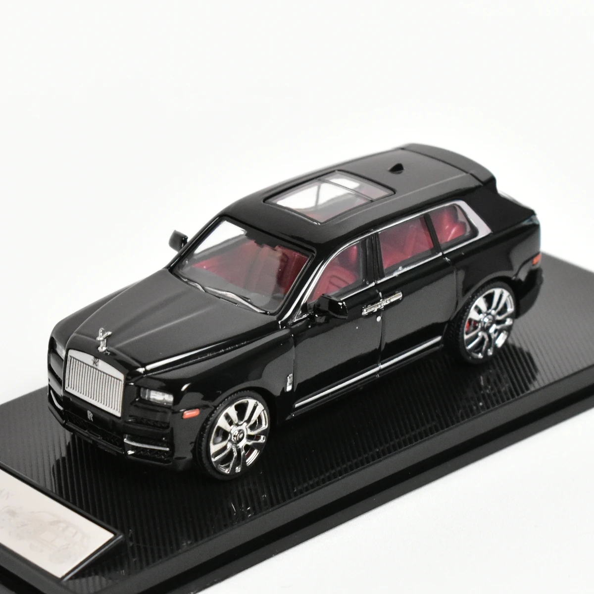 Imagine adding a touch of luxury to your collection with this meticulously crafted diecast model. Finished in a sleek, matte black, it captures the elegance and grandeur of the full-sized Rolls-Royce Cullinan SUV. Every detail is designed for realism, including a prominent chrome grille with vertical slats, a regal Spirit of Ecstasy hood ornament, and rectangular headlights with clear lenses. The transparent windows reveal a striking red interior, providing a stunning contrast against the dark exterior. Silver multi-spoke rims with intricate detailing beautifully complement the black tires, enhancing its premium appearance. This model is perfect for adult enthusiasts who appreciate high craftsmanship and sophisticated design.