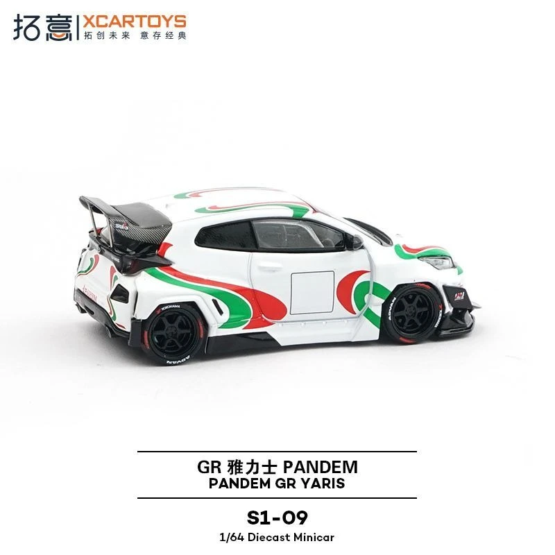 Step into the world of racing with this highly detailed diecast model car, expertly crafted for enthusiasts and collectors alike. Measuring 1:64 scale, it captures every nuance of a sleek, aerodynamic racing vehicle. The body boasts a stunning white finish, accented by bold, swirling green and red streaks that run along the sides and over the hood, creating a vibrant, energetic look. The contrasting black side mirrors, tinted windows, and multi-spoke wheels add depth and realism. The textured rear wing spoiler, resembling lightweight carbon fiber, completes the sporty silhouette. Perfect for display or imaginative play, this model embodies precision and craftsmanship, making it a striking addition to any collection or racing setup.