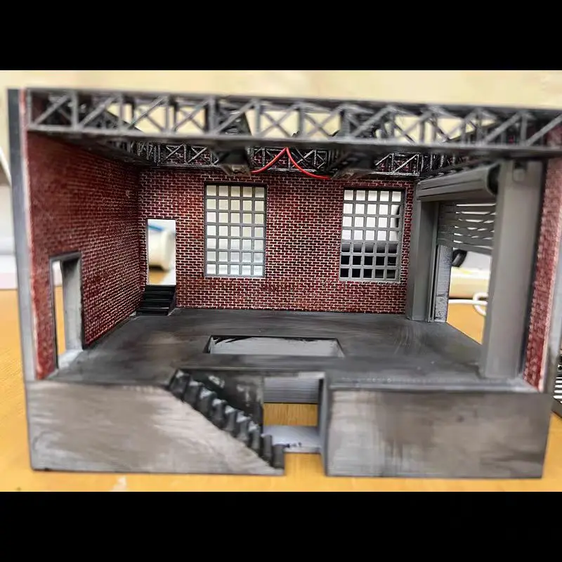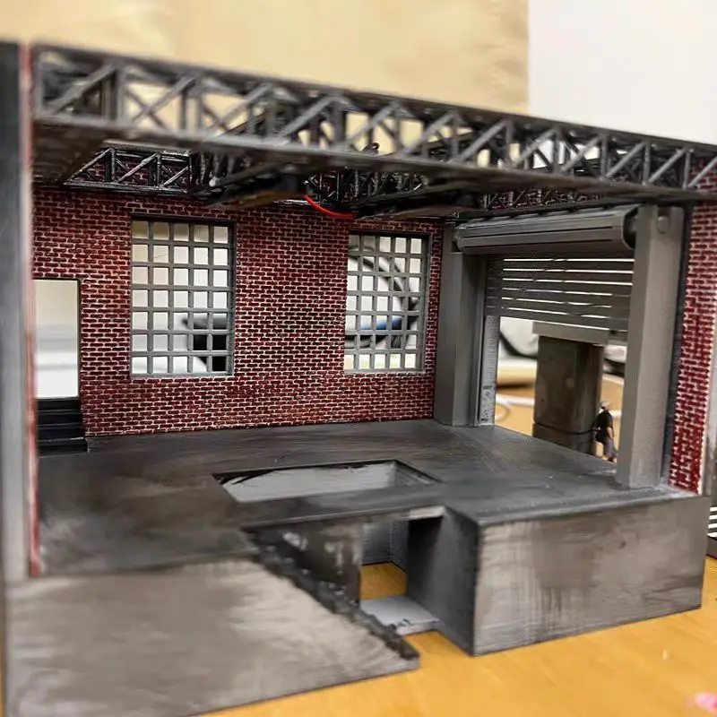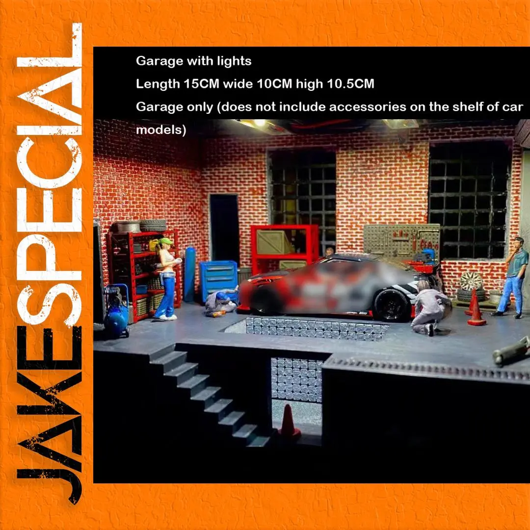 Transform your space with this stunning 1:64 scale diorama garage model. Crafted from high-quality resin, this collectible features a traditional brick-patterned exterior and an inviting large open doorway. Upon stepping inside, you're welcomed by intricate details like textured concrete flooring, raised areas resembling a car repair lift, and shelves filled with tools and equipment, creating a busy workshop atmosphere. Integrated lighting enhances its charm, illuminating every corner and preparing it for brilliant photography. Miniature figures enhance the lively scene, making it a perfect centerpiece for any car enthusiast or decorative display.