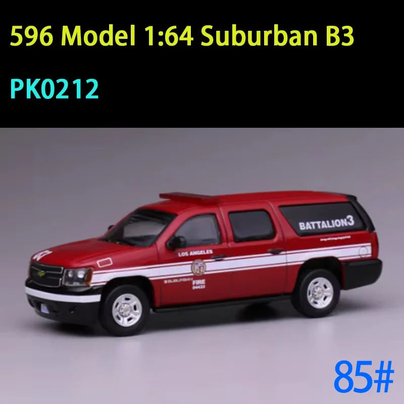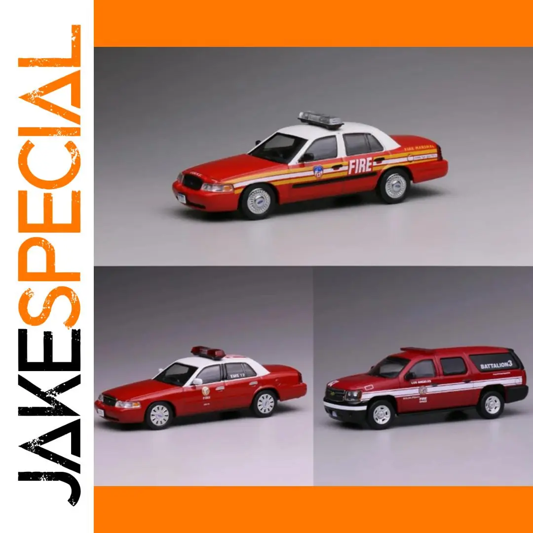 This highly detailed 1:64 scale diecast model features emergency vehicles including a fire engine, police car, and patrol SUV, crafted from alloy and ABS plastic for durability. The fire engine, in red with a white roof and black light bar, showcases a sleek, sedan-like design with realistic grille and headlight details. The police car, also in red with white accents, displays “L.A. POLICE” insignias, clear windows, and silver hubcaps. The patrol SUV carries a bold white stripe with “BATTALION 3.” Perfect for display, collection, or as a gift, these static models are designed for adult collectors and enthusiasts, emphasizing realism and quality.