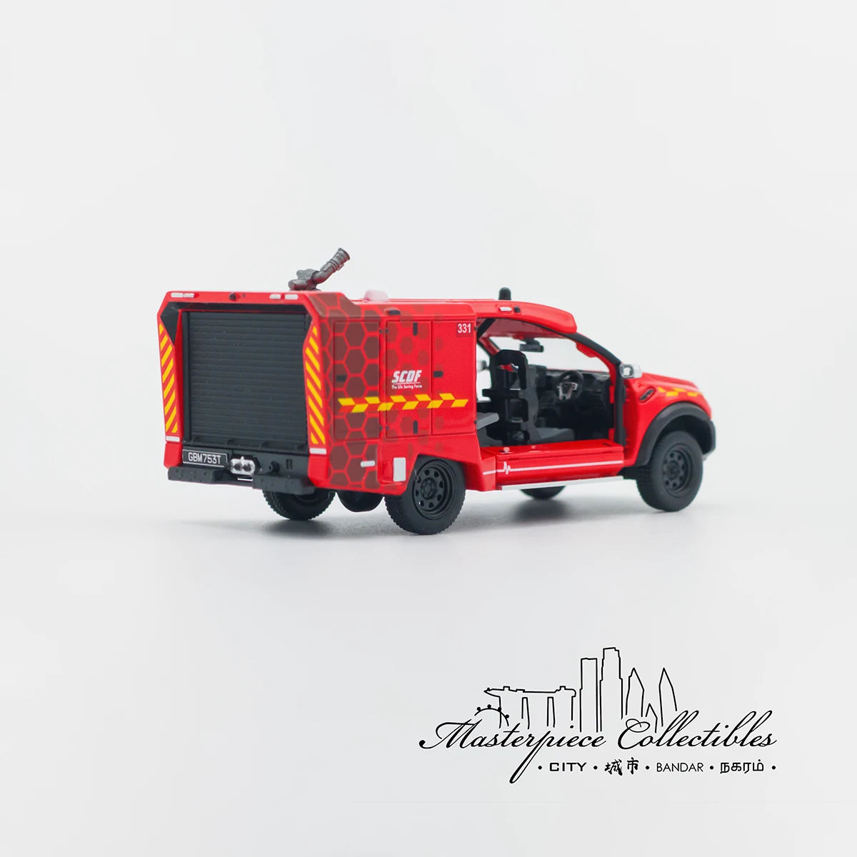 - Features include black tinted windows, side mirrors, textured rubber tires with tread patterns, a roof siren light, and a mounted water cannon, adding to its authentic silhouette.