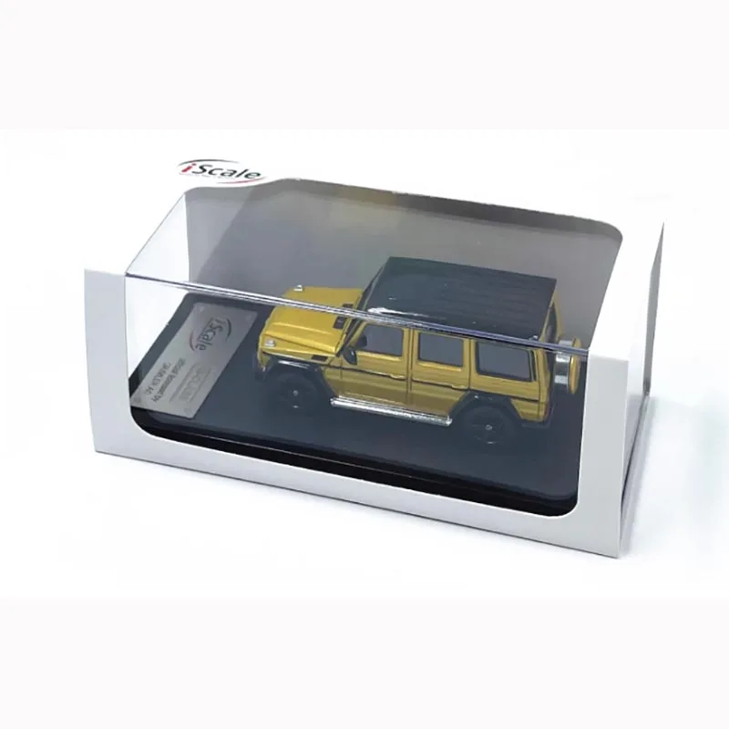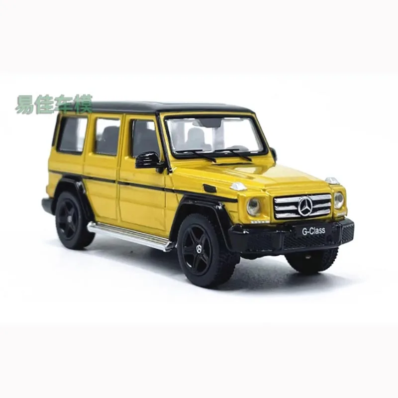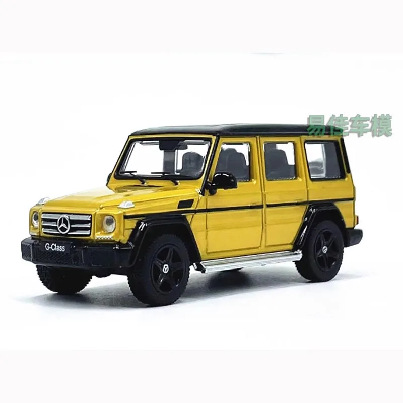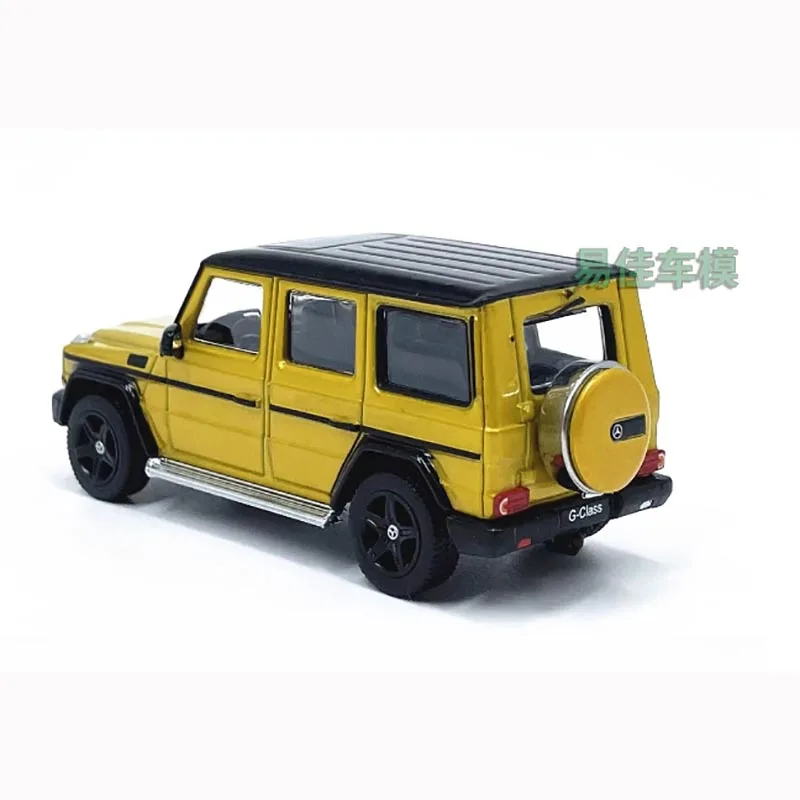 Experience the allure of a meticulously crafted diecast model with this 1:64 scale G-Class off-road vehicle. Finished in a vibrant bright yellow with a striking black roof, it captures attention effortlessly. The intricate details, including a distinctive Mercedes-Benz grill, reflective headlights, and clean lines, highlight its authenticity. The model's chrome accents and sleek black alloy wheels enhance its sporty stance, making it a perfect addition to your collection. With no moving parts and no batteries required, it serves as a static ornament that beautifully merges elegance and ruggedness. Display it proudly as a testament to craftsmanship that resonates with car enthusiasts and collectors alike.