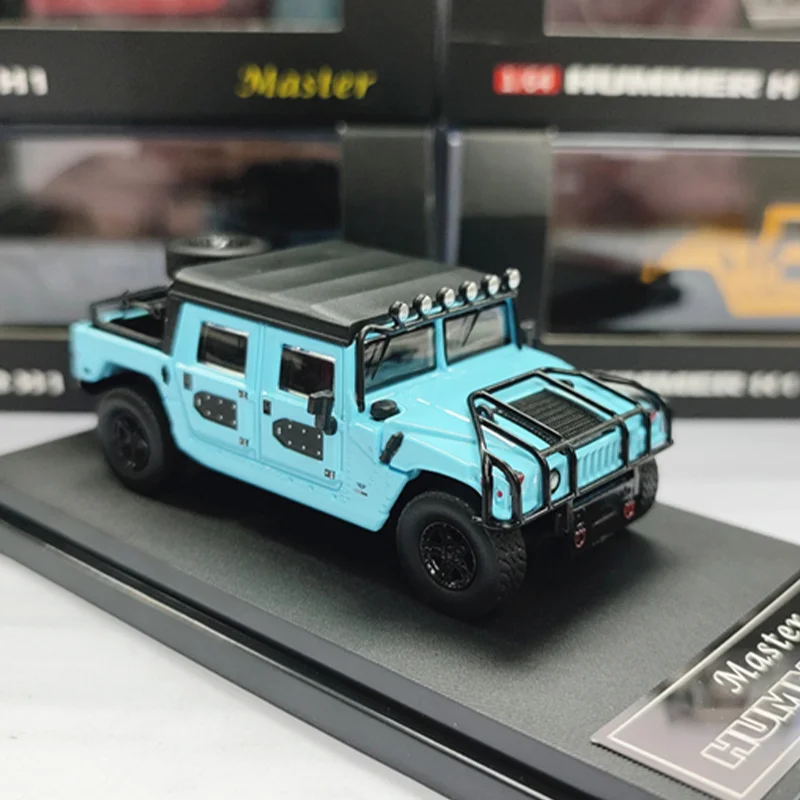 This exquisite 1:64 scale model of the Hummer H1 Pickup is a must-have for any collector. Available in two stunning color variants—bright yellow and teal blue—each model showcases meticulous attention to detail. The bright yellow version features a functional front grille, headlights, and a rugged black roof rack with added lights. The teal blue variant matches this with a contrasting black roof and an authentic spare tire mounted on the roof. Each model rests elegantly on a black display base, housing the name “Master Hummer H1” in gold lettering, making it a centerpiece in your collection.