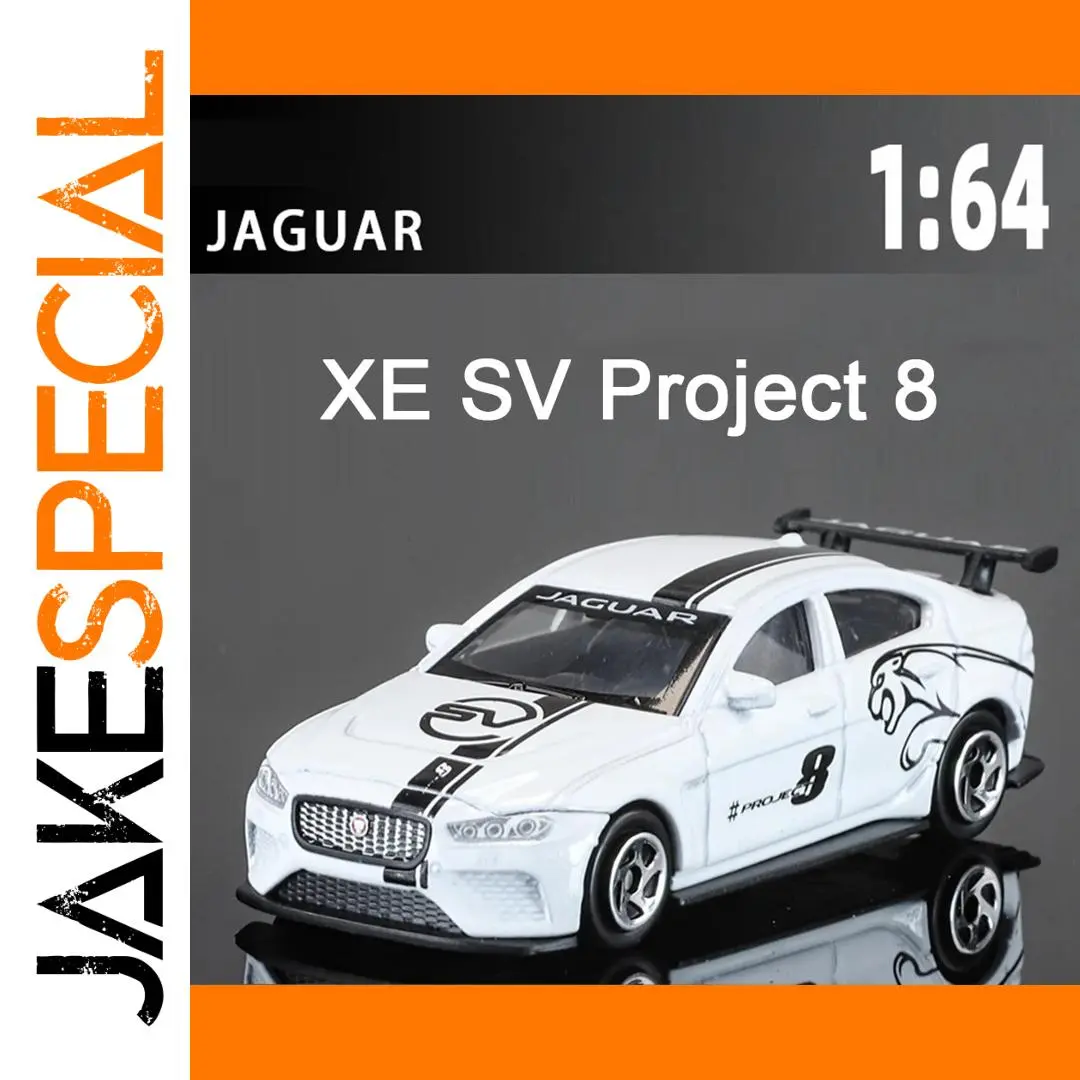 Experience the thrill of owning this highly realistic 1:64 scale diecast model of the Jaguar XE SV Project 8. Crafted with precision, this miniature captures the sporty design elements, including a sleek white exterior accented with bold black graphics, a distinctive black stripe running from the hood over the roof to the rear, and a striking black lion head decal on the side door. The model features a detailed grille with a shiny Jaguar emblem, sleek headlights, and a sculpted front bumper that emphasizes its dynamic character. The transparent windshield and side windows reveal a carefully detailed interior, complemented by side mirrors and a rear spoiler for an authentic look. The high-quality black rubber tires paired with silver five-spoke wheels enhance its realistic appeal, making it perfect for display or collection. Its compact size of about 8 x 3.3 x 3.2 cm ensures it fits neatly on any shelf or desk, adding a touch of sporty elegance to your collection or workspace.