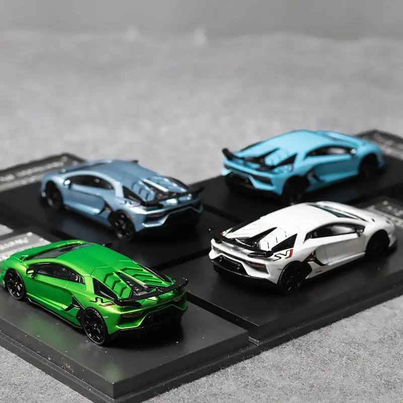 Explore the stunning collection of 1:64 scale miniature diecast models of the Lamborghini Aventador SVJ LP770-4. Each model measures approximately 7 cm in length and is meticulously crafted from a blend of alloy and plastic materials. Choose from vibrant colors including metallic green with a glossy finish, striking light blue, a slightly darker sky blue featuring intricate details, and a clean white model with bold black accents. With an emphasis on accurate design elements, these cars showcase the aerodynamic style of the Aventador. Perfect for collectors, this set captures the essence of luxury automotive craftsmanship.