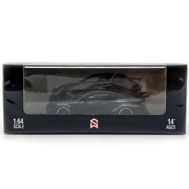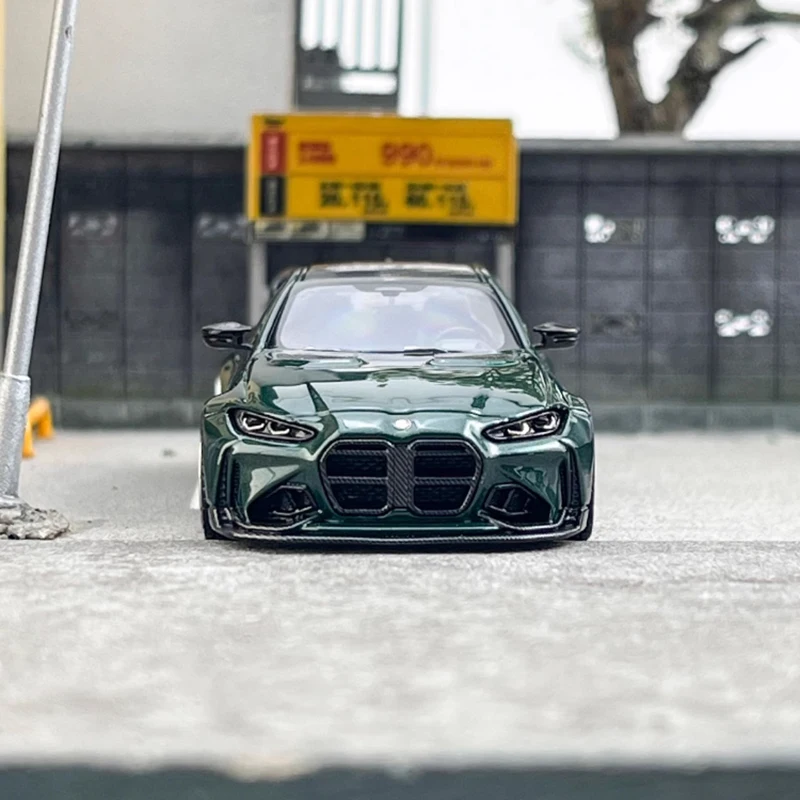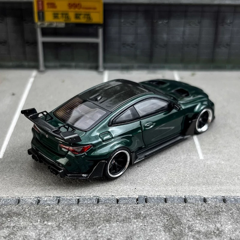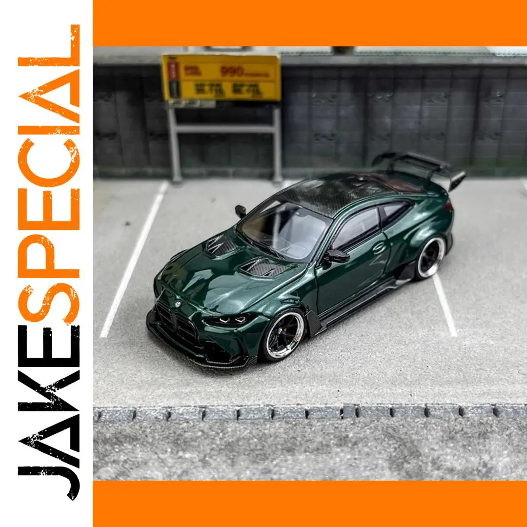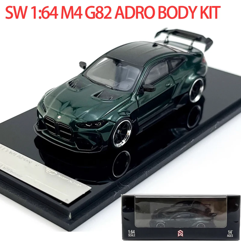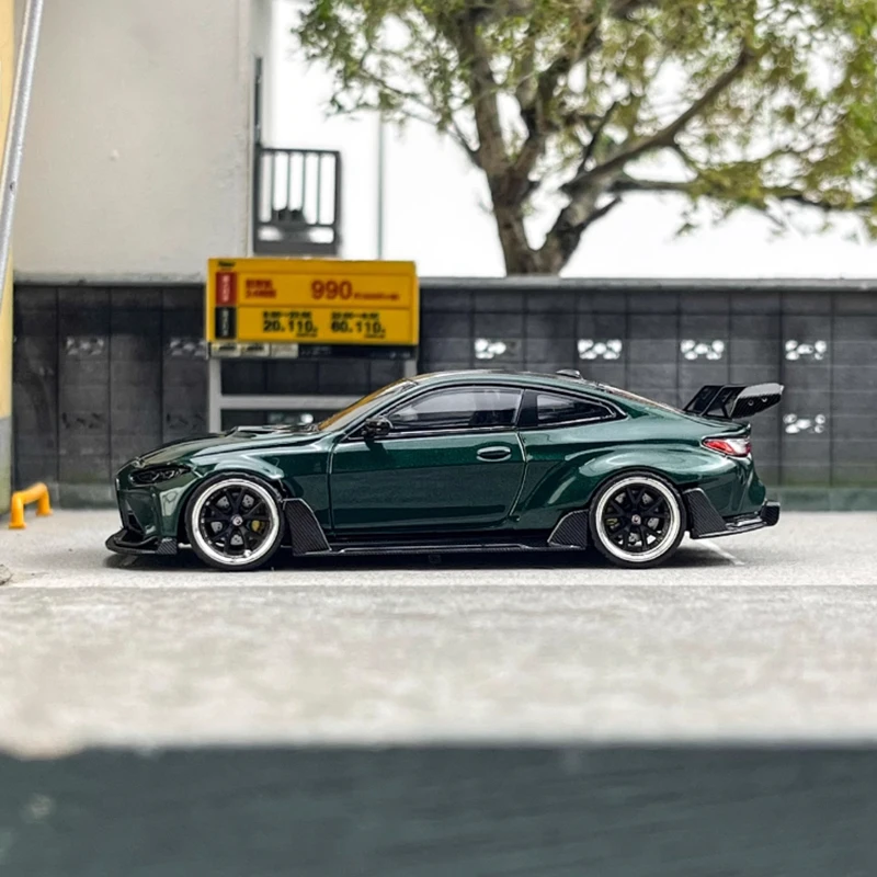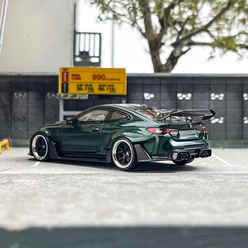 Experience the thrill of owning this meticulously crafted 1:64 scale diecast alloy car model representing the iconic M4 G82 ADRO, engineered with a striking wide body modification. Painted in a gleaming, deep, glossy dark green finish, complemented by a sporty black carbon fiber-look roof, this model exudes a sense of speed and sophistication. Every component— from the vented hood to aerodynamic front fascia, wide fenders, and aggressive side skirts— reflects a racing-inspired aesthetic. The multi-spoke black wheels with silver rims and low-profile tires enhance its performance vibe, culminating in a realistic rear spoiler and sleek taillights. This model is perfect for collectors, enthusiasts, or as a statement decoration, making it the ideal gift or display item for adults who appreciate automotive design and craftsmanship.