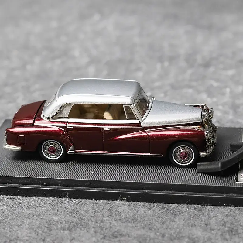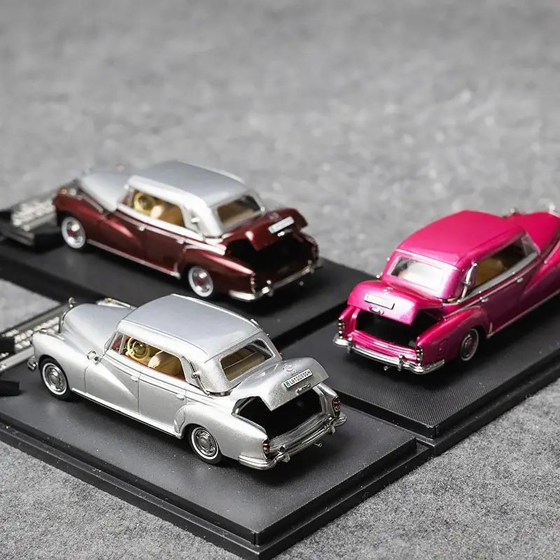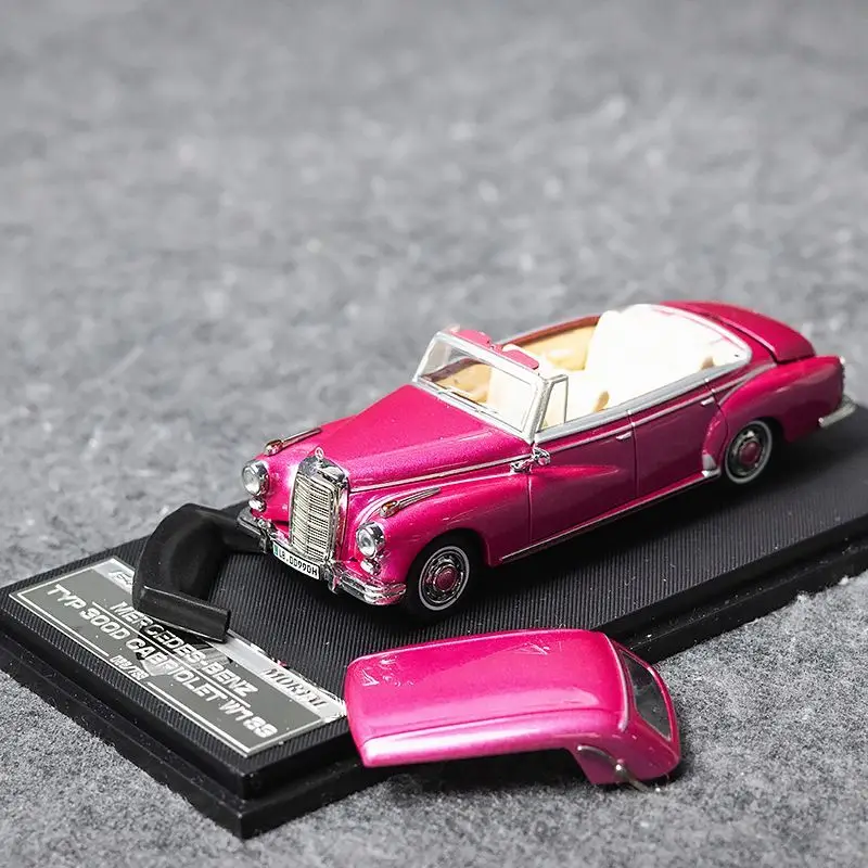 Experience the timeless charm of this meticulously crafted 1:64 scale die-cast model car by TAKARA TOMY. Designed to resemble the classic Mercedes-Benz 300D convertible, this collectible features stunning vintage styling with smooth, refined lines that evoke nostalgia and sophistication. The model comes in vibrant colors—shiny metallic silver, deep glossy burgundy, and bright pink—offering a striking contrast of vivid hues and lustrous finishes. Its detailed surface includes chrome accents on the grille, side trims, bumpers, and window frames, emphasizing its luxurious appeal. The retractable roof reveals intricately painted beige or cream interiors, adding realism and elegance to this beautifully detailed miniature. It's perfect for display and personal collections for adult enthusiasts.