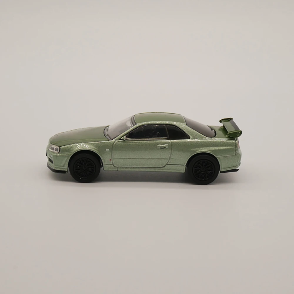 Discover this beautifully crafted miniature of the iconic Nissan Skyline GT-R (BNR34), measuring approximately 1:64 of the original vehicle. Featuring a sleek, aerodynamic silhouette in a charming pastel green, this die-cast model exudes both sporty sophistication and vintage charm. Its smooth, precise contours highlight the car's dynamic design, complemented by detailed features like clear plastic headlights, windows, and a prominent rear wing spoiler. The black multi-spoke rims and treaded rubber tires add realism and contrast, making it a striking collectible piece. While the model bears minor paint flaws, its overall craftsmanship and authentic likeness make it an excellent decorative item for car enthusiasts and collectors. It’s perfect for display, gifts, or personal appreciation.