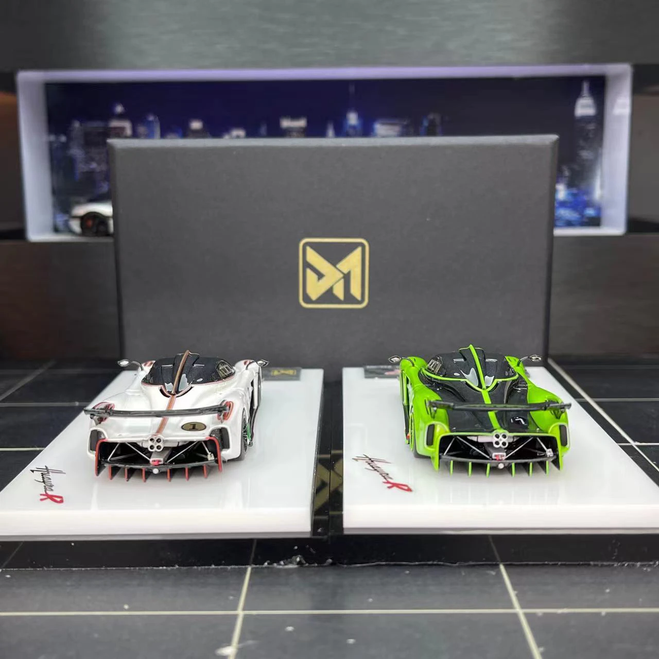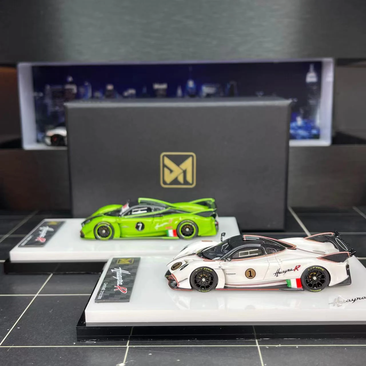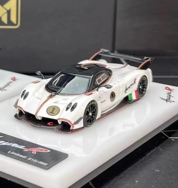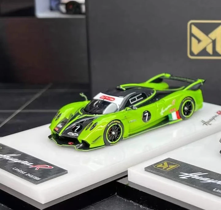 Step into the world of high-performance racing with this stunning 1:64 scale Pagani Huayra R resin model car. With intricate detailing, it captures the essence of automotive excellence. The vibrant green finish of the first model is elegantly accented by a black racing stripe and sponsorship decals, showcasing racing number “1” on the hood, while the white and black model with red trim offers striking contrasts and equally meticulous details. These models are ideal for collectors, proudly displayed on sleek white bases with black accents. The incredible craftsmanship features defined headlights and aerodynamic designs that reflect the true racing spirit, making this an unmissable addition to any collection.