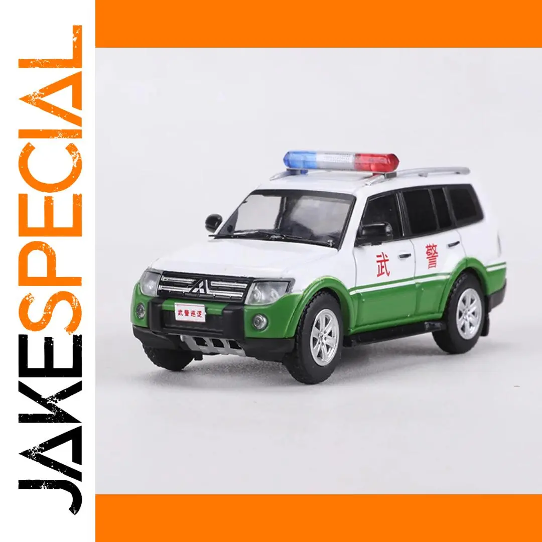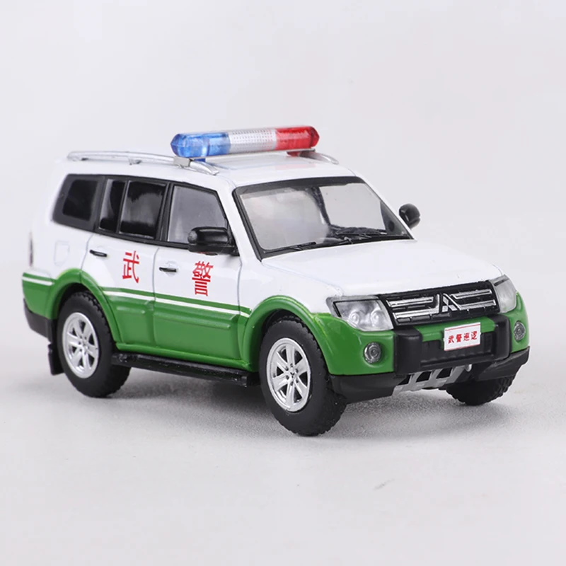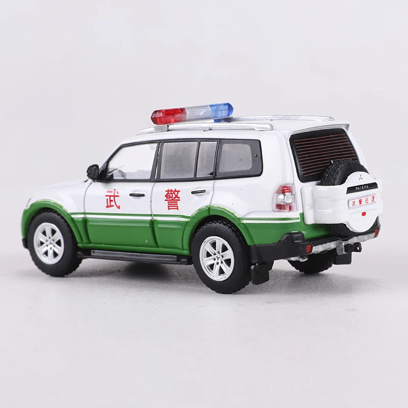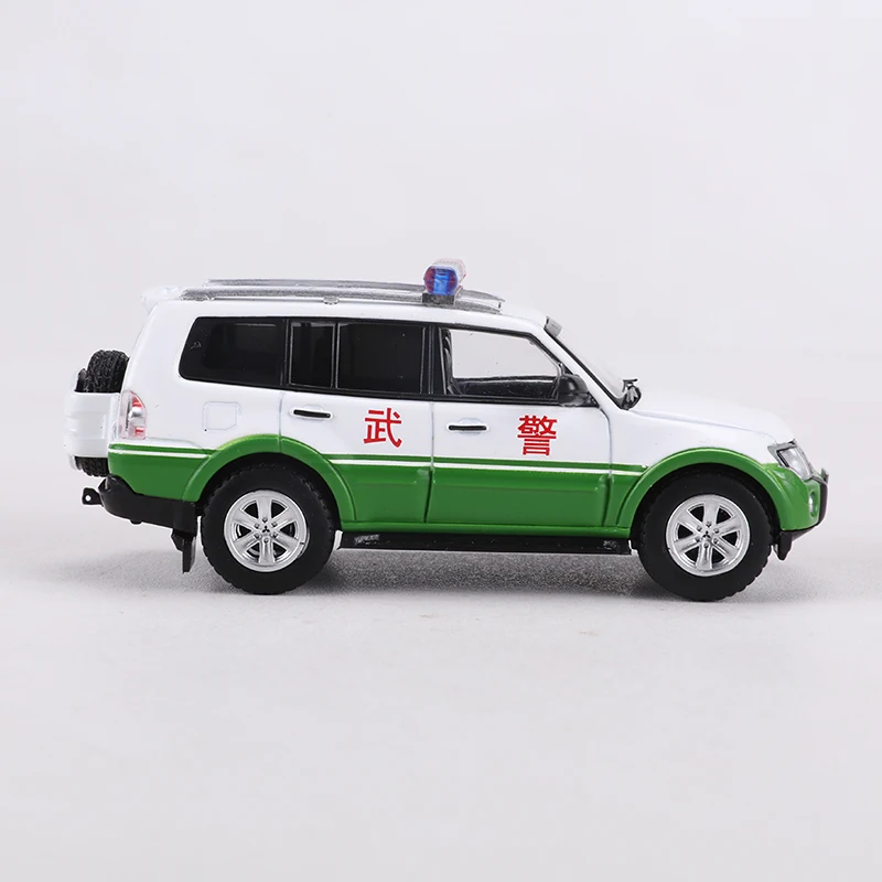 - This 1:64 scale diecast model showcases a realistic Pajero V97 police vehicle, with a white main color accented by vibrant green details on the lower body, emphasizing its official law enforcement look.