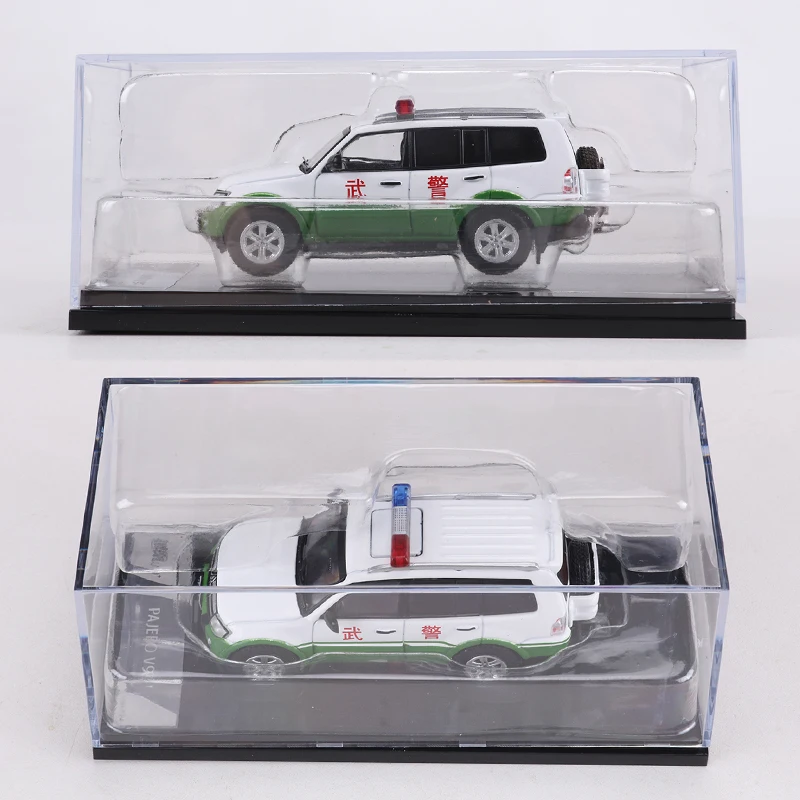 Experience the thrill of owning this highly detailed diecast model of the Pajero V97 police vehicle. Crafted at a 1:64 scale, this miniature offers a realistic portrayal of a law enforcement SUV with vibrant white and green colors. The front grille features intricately molded silver accents with a bold black horizontal bar, reflecting true vehicle styling. Clear plastic windows reveal a minimal interior, while the roof-mounted light bar combines translucent blue, clear, and red sections, adding authenticity. Red Chinese characters on the side doors emphasize its official police insignia. The model includes realistic white rims with black tires, black side mirrors, and molded black bumpers, all designed for durability and authenticity, perfect for collectors or display purposes.