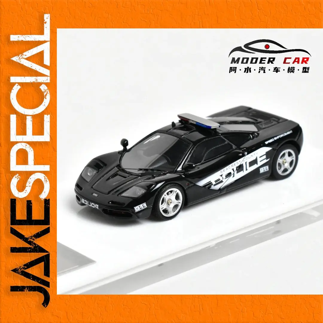This 1:64 scale diecast model car captures the sleek, aerodynamic design of a police vehicle with a black resin body, sharp angular accents, and a streamlined low-profile silhouette. It features clear plastic windows revealing intricate interior details, white decals with bold black text reading “SEAREST COUNTY” and “POLICE,” and a small flat light bar with silver, blue, and red lights on the roof. Silver five-spoke wheels with detailed gold hubs and black tires with a subtle tread pattern add to its realistic, sporty appeal. Crafted from durable resin, this detailed replica offers a high-quality collectible for adult enthusiasts.