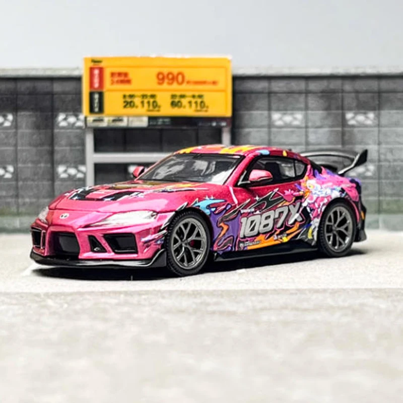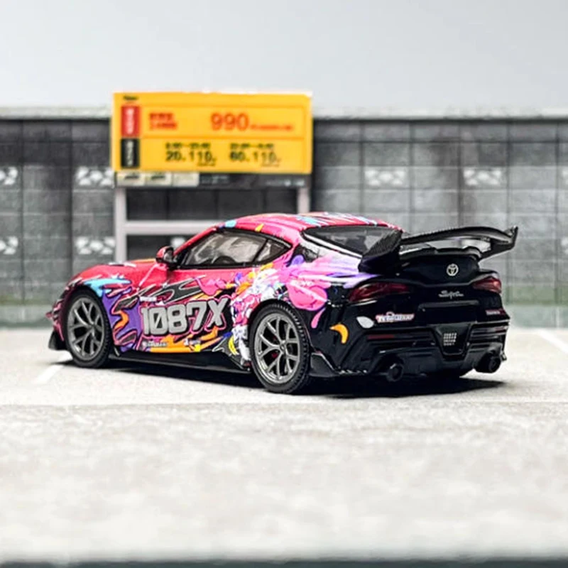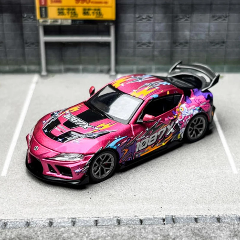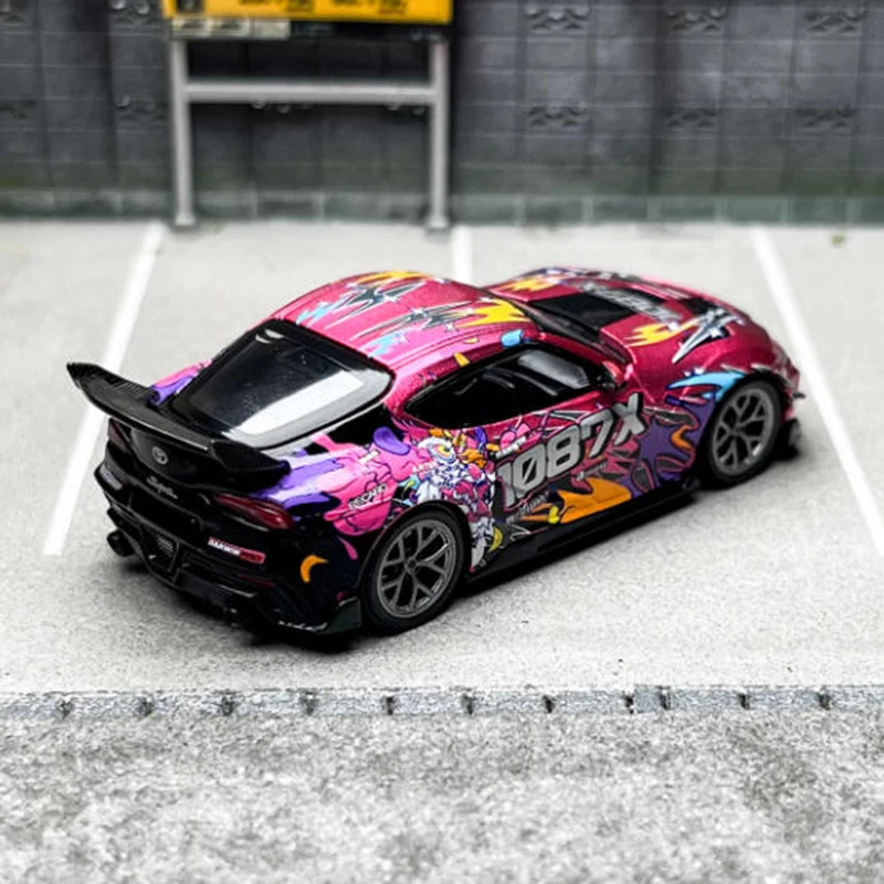 Immerse yourself in the vibrant world of collectibles with this stunning 1:64 scale model of the GR Supra A90 66G. This static diecast model showcases a breathtaking blend of bold pink, purple, and black hues, enhanced by a dynamic graffiti-style graphic featuring “1087X.” Crafted from a durable alloy and plastic mixture, its sharp angular lines and sporty aesthetic mirror the real vehicle’s iconic design. Whether placed on your display shelf or gifted to a fellow enthusiast, this model captures the essence of automotive artistry without any need for batteries or electrical components. It’s perfect for those who appreciate detailed craftsmanship in their collection.