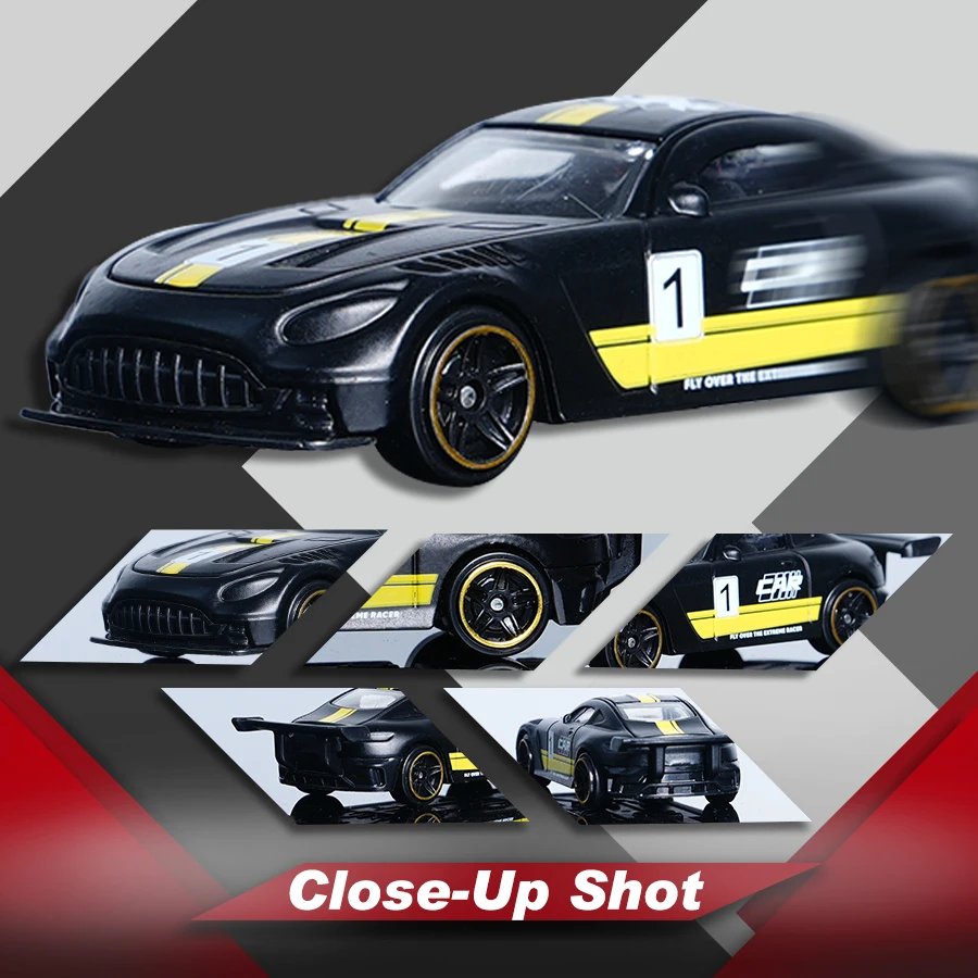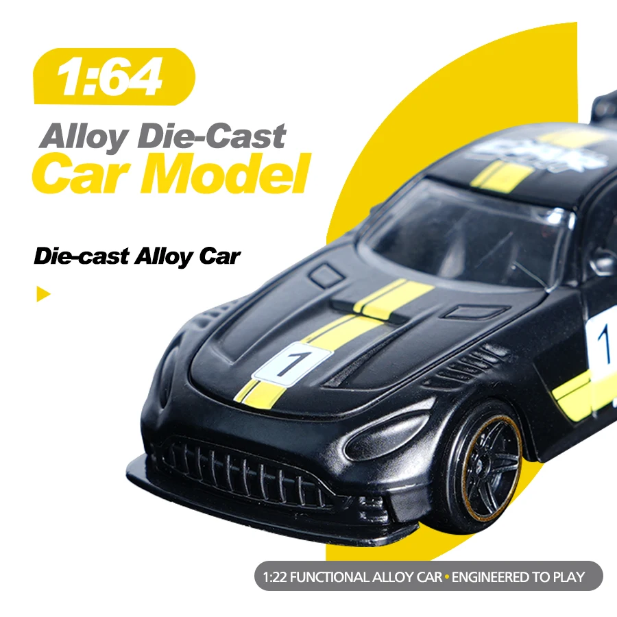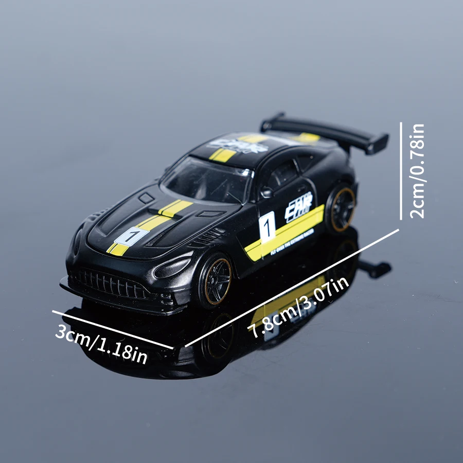 Step into the world of high-speed racing with this stunning diecast model, meticulously crafted to capture the sleek, aerodynamic essence of a real sports car. Designed with attention to detail, this 1:64 scale racing car boasts a glossy black finish accentuated by vibrant yellow racing stripes running along the center of the hood, roof, and rear, creating a bold visual statement. White decals, including a prominent “1/2” number, add to its authentic racing aesthetic. The compact size makes it ideal for display on desktops, shelves, or as a collectible gift for enthusiasts. Its realistic, energetic design invites you to imagine the thrill of racing, making it a perfect addition to any collection or decor.