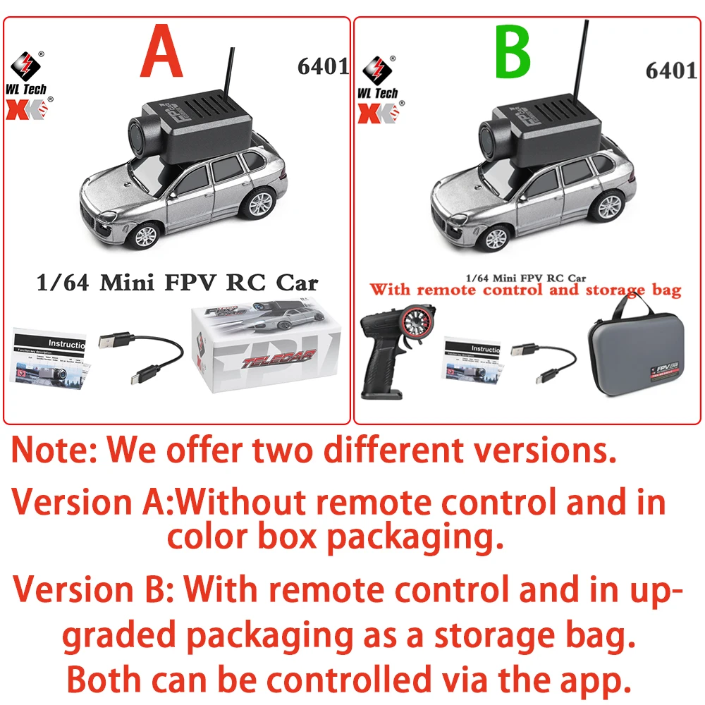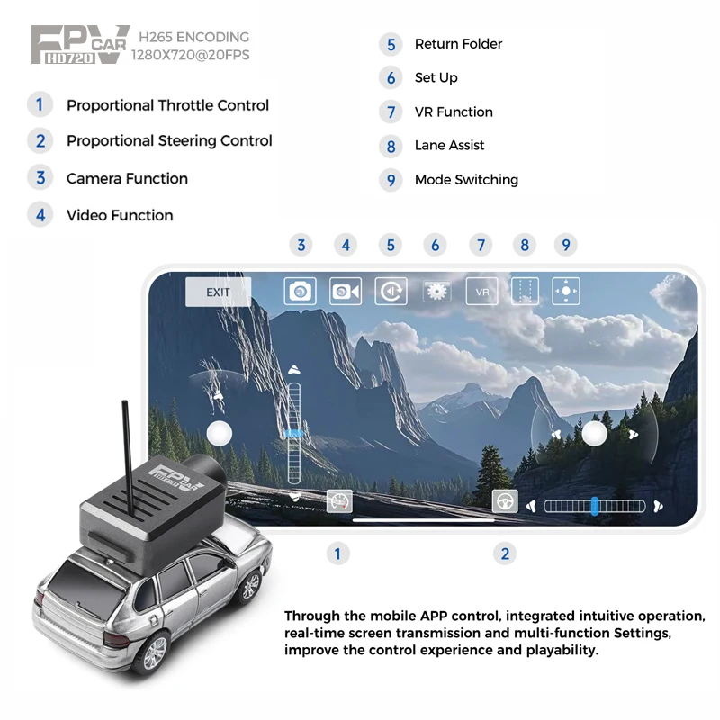 Experience high-tech excitement with this 1:64 scale RC car, measuring 6.8 x 3.2 x 3.9 cm and weighing 29.3 g (naked). Equipped with a 720P wide-angle FPV camera for delay-free HD video transmission, it offers a maximum speed of 3 km/h with three adjustable settings (1.7 km/h, 2.5 km/h, and 3 km/h) and about 15 minutes of play per charge. Powered by a 3.7V 100mAh lithium battery with a 30-minute USB charging time, it features a 0610 coreless motor, WiFi control range of 30 meters, and a built-in gyroscope for precise steering and stability. Additional features include blue atmospheric lights, shock-absorbing front wheels, and app control for capturing photos, videos, and VR.