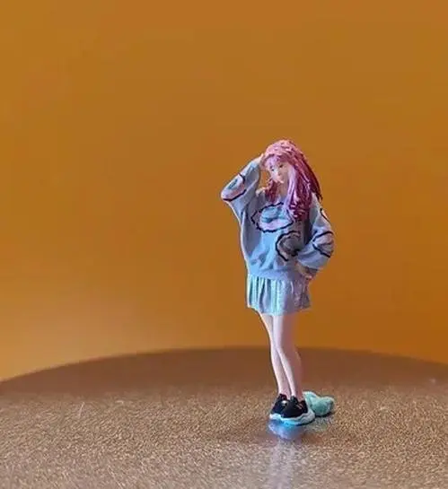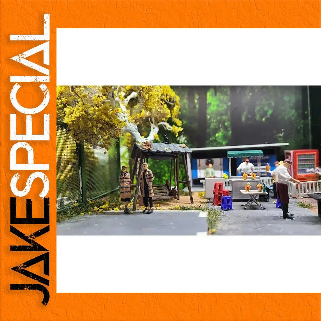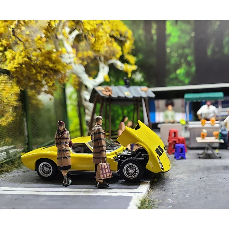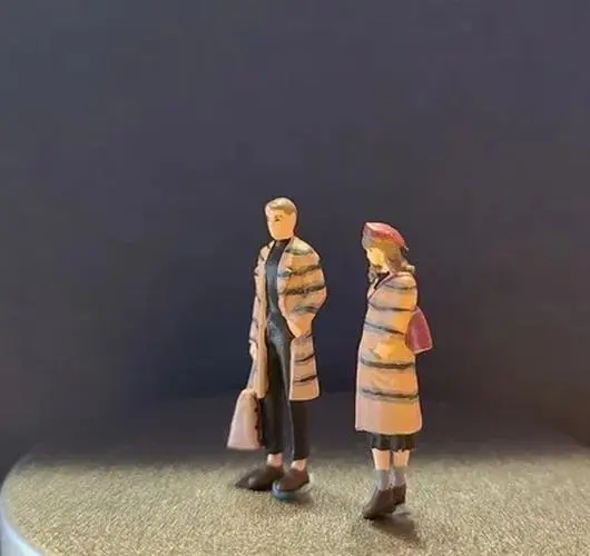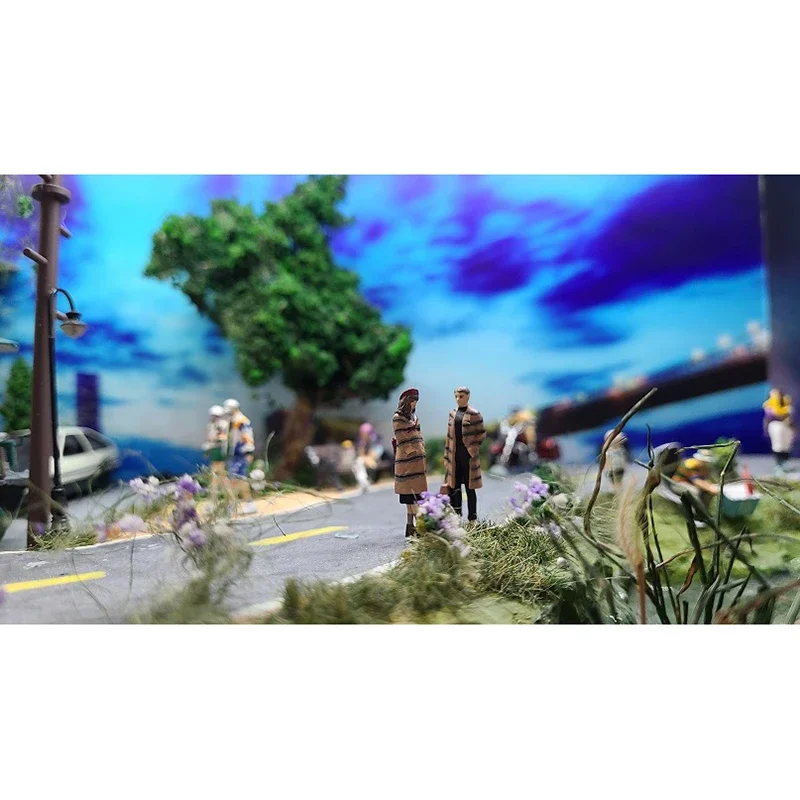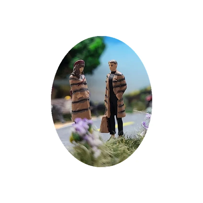 This beautifully crafted miniature scene features a romantic couple styled in coordinated outfits. Each figure, made from environmentally friendly resin, stands approximately 2-3 cm tall at a 1:64 scale, perfect for collectors and enthusiasts. The female figure dons a long, plaid coat, fitted at the waist and paired with chic knee-high boots, showcasing an elegant yet casual look. The male figure complements her with a matching coat, crafted in harmonious colors. They are set against a delightful backdrop of a rustic swing and greenery, enhancing the tranquil park atmosphere of this exquisite piece. Ideal for display, this hand-painted model highlights meticulous craftsmanship and vibrant colors.