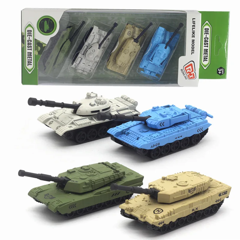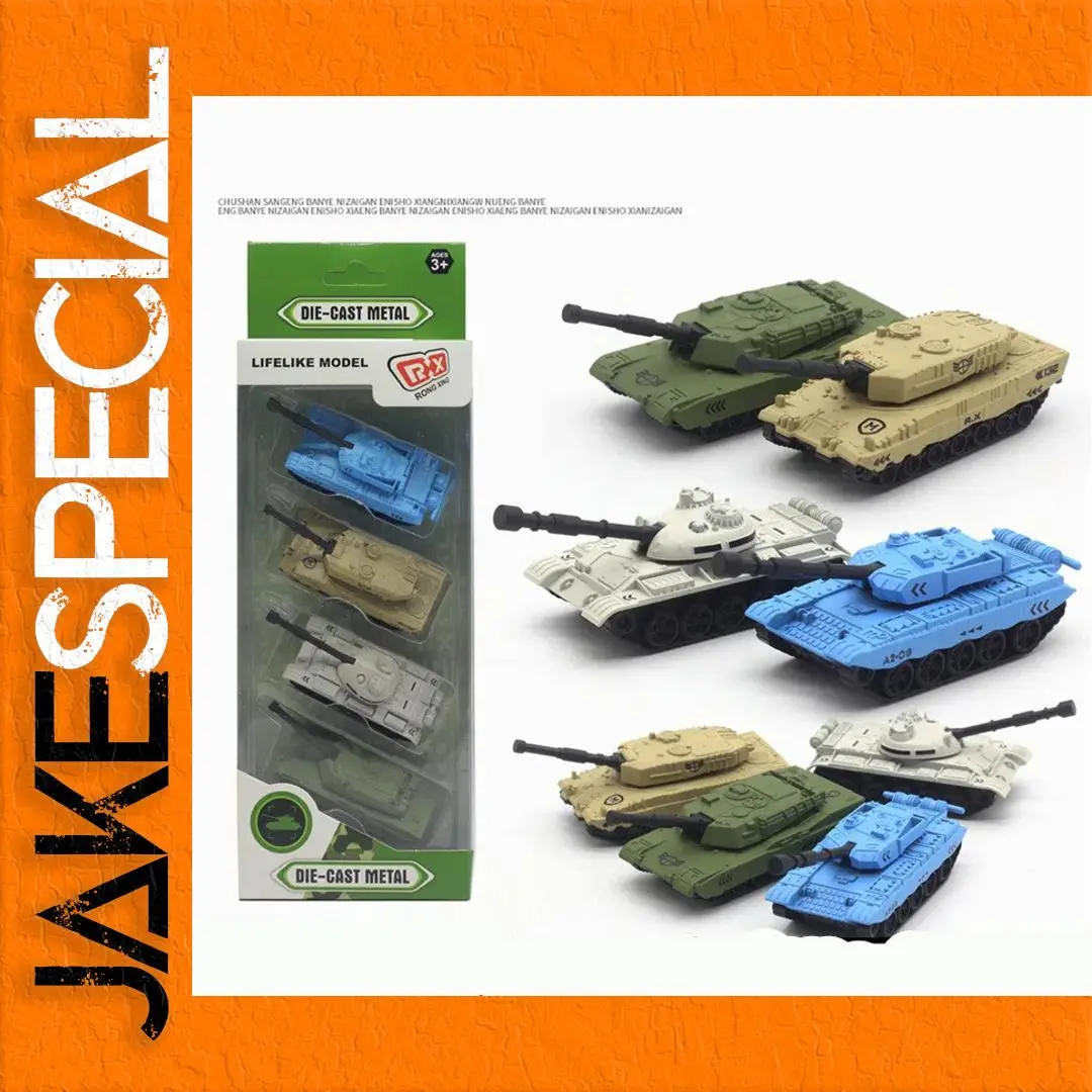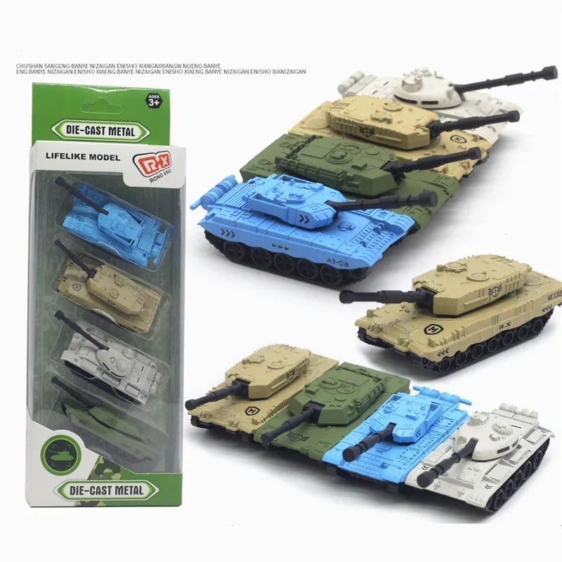 Experience the thrill of military action with this stunning 1:64 scale T55 military tank model set. Showcasing intricate details and vibrant colors, each model is aesthetically captivating and designed for collectors and enthusiasts alike. Crafted from high-quality zinc alloy with plastic and rubber components, these four unique tanks—green, tan, white, and blue—each measure approximately 9 cm in length. These non-battery-operated tanks feature realistic turrets, long barrels, and molded details such as hatches and armor plating. Whether displayed on a shelf or used for imaginative play, this model set is perfect for anyone looking to add a touch of military inspiration to their collection.