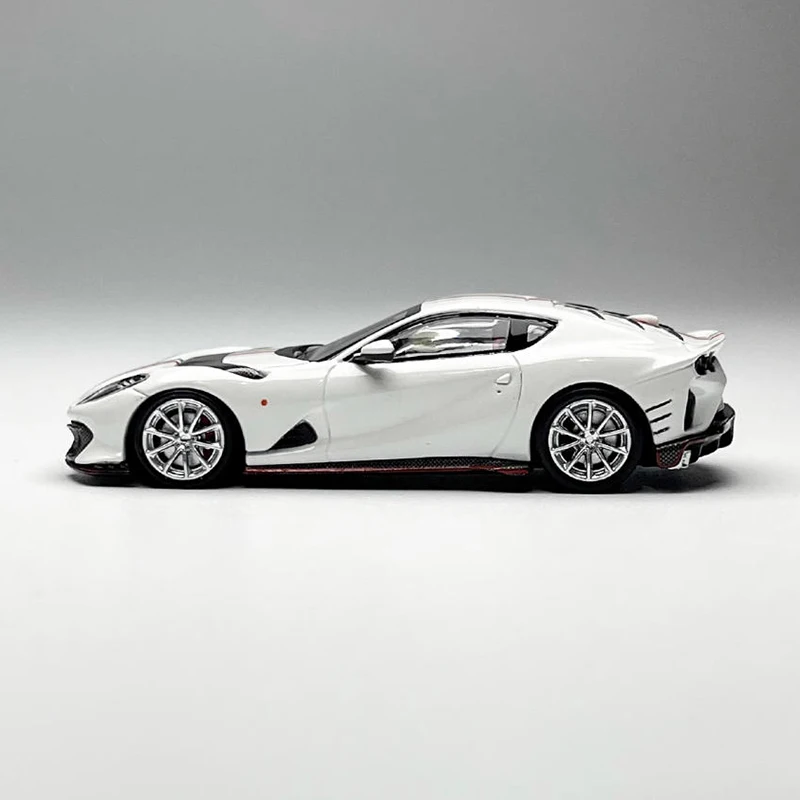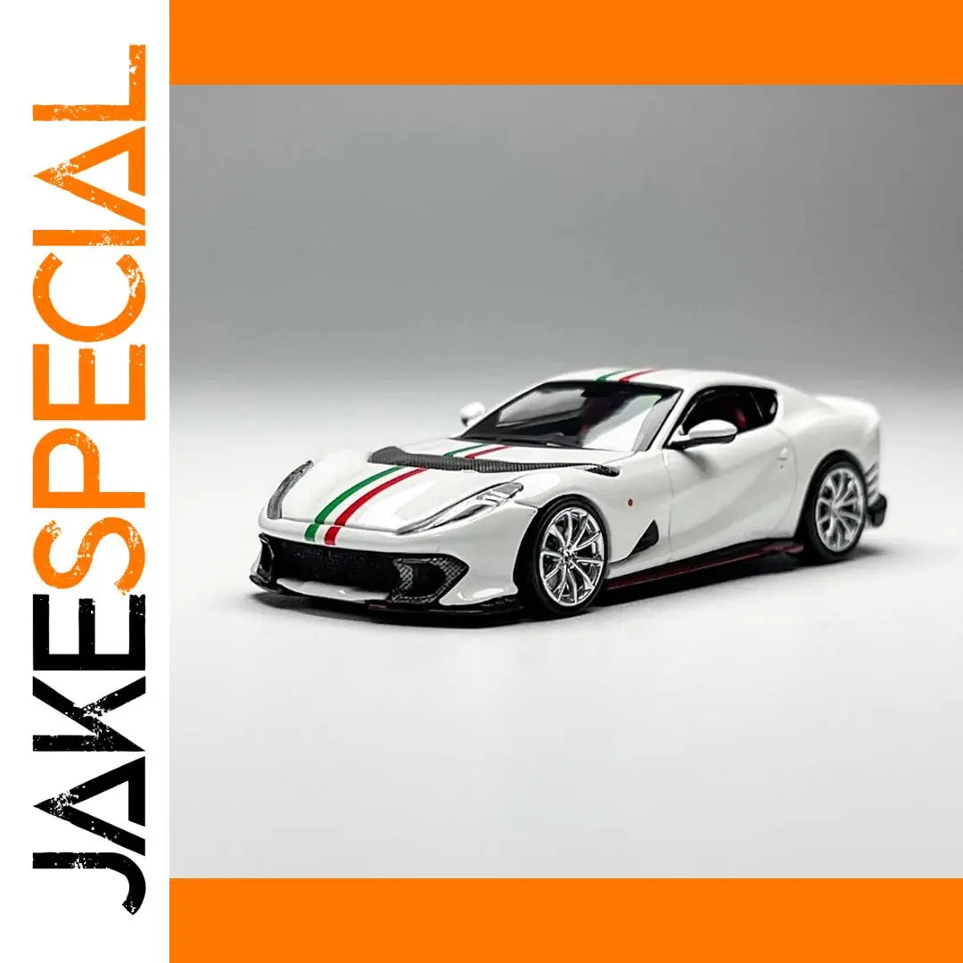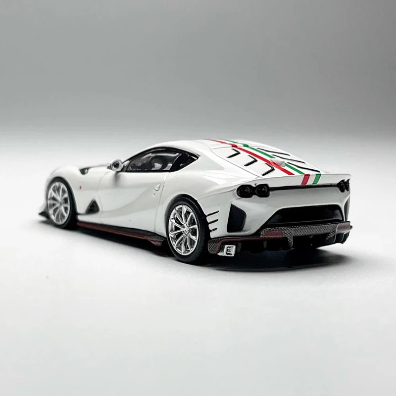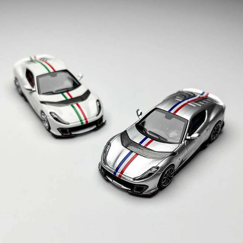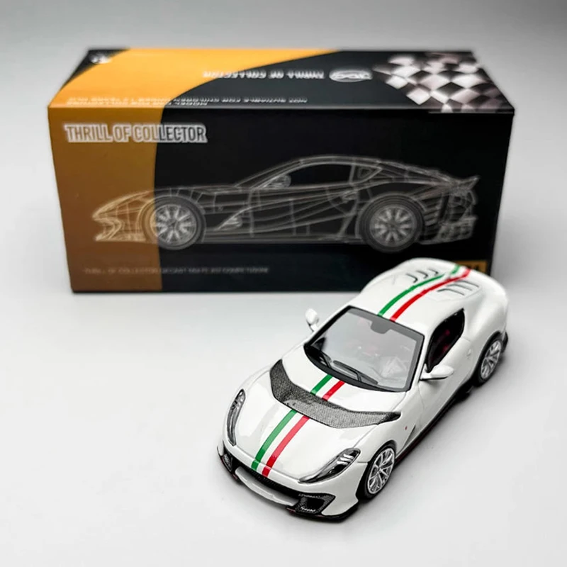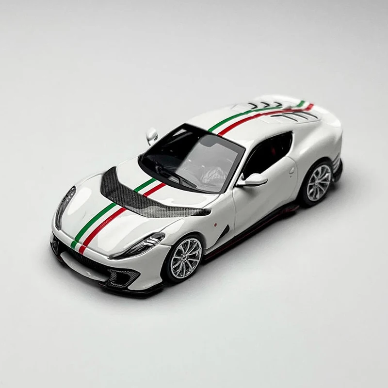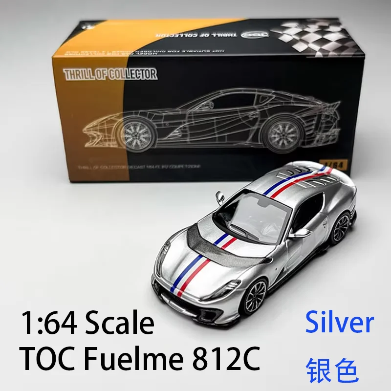 Experience the thrill of high-performance automotive design with this highly detailed 1:64 scale model of the TOC Fuelme 812C alloy sports car. Crafted with precision from alloy, it boasts a sleek, aerodynamic body finished in pristine white or metallic silver that catches the light beautifully. The model's bold racing stripes—centered red flanked by green lines—add a vibrant, sporty touch, making it perfect for display and collection. Its realistic features include a honeycomb grille, sharp angular headlights, sculpted door panels, tinted black windows, and multi-spoke alloy wheels. Compact and meticulously crafted, this model captures the essence of speed and sophistication, ideal for car enthusiasts and collectors seeking to showcase their passion.