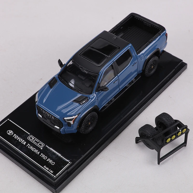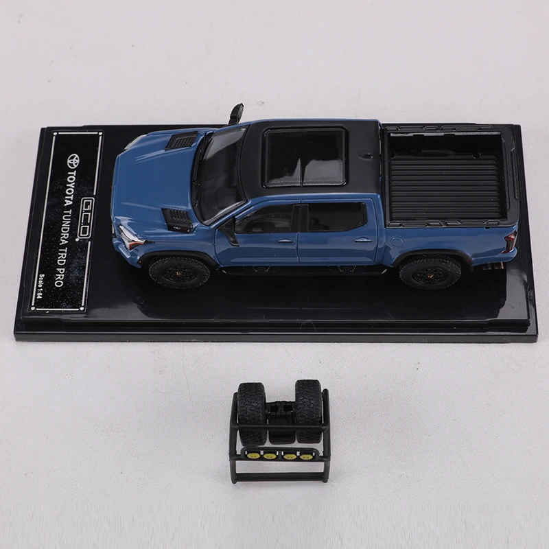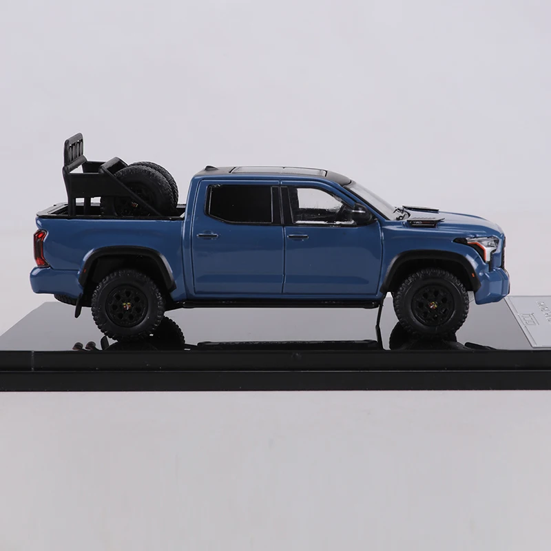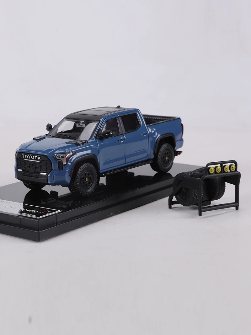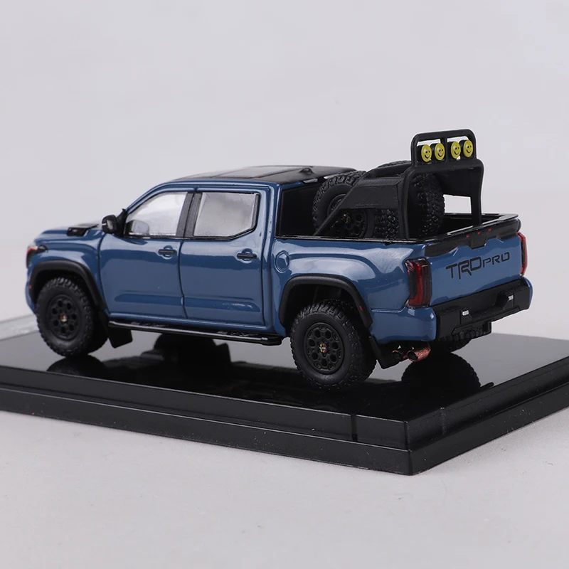 This 1:64 scale diecast model of a Toyota Tundra TRD PRO features a glossy blue finish with black accents, highlighting its rugged, off-road-ready design. Made from durable metal, it showcases detailed craftsmanship with a prominent black grille, clear headlight lenses, textured truck bed, and realistic black wheels with treaded tires. Perfect as a collectible display piece, this non-electric replica is designed for enthusiasts aged 14 and up, capturing the bold style and muscular stance of the full-sized truck in a compact, highly detailed miniature. A must-have for any Toyota truck collector or diecast model enthusiast.