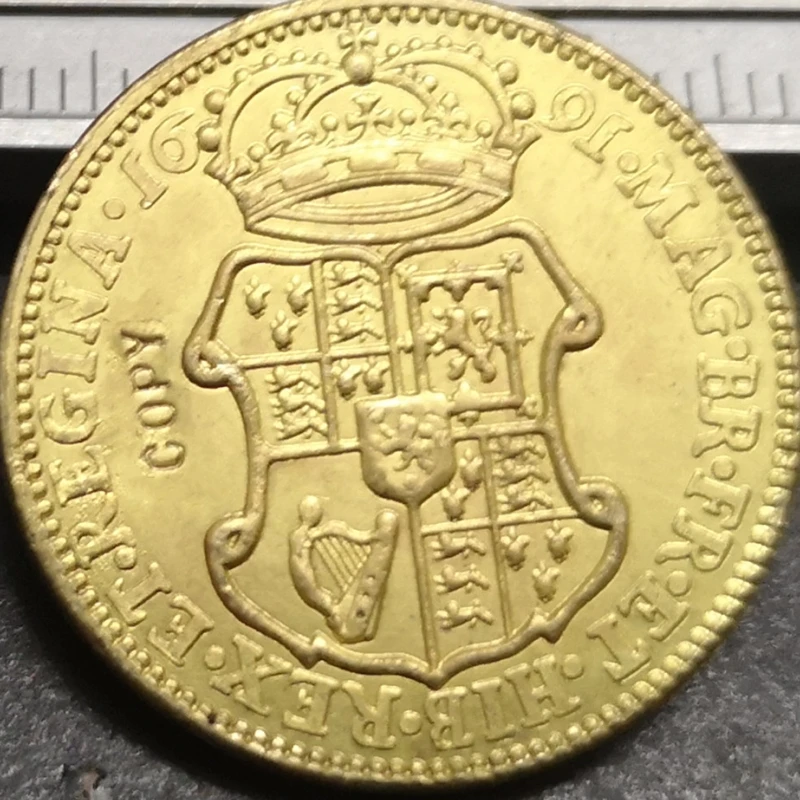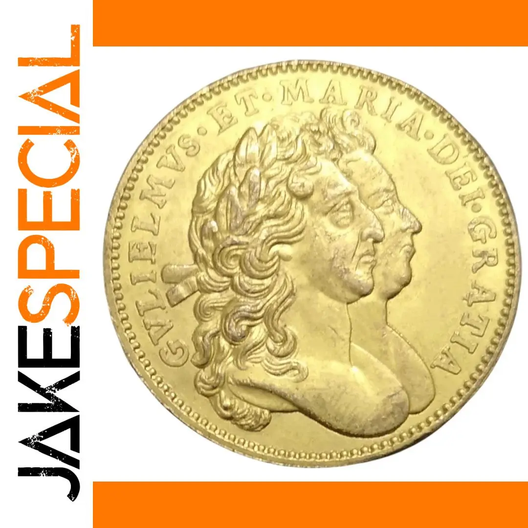 Experience the timeless charm of this stunning replica coin modeled after the historic 1691 England 1 Guinea. Crafted meticulously from metal with a polished, gold-colored finish of 99.99% purity, it exudes an authentic appearance resembling pure gold. The coin's round shape is accentuated by intricate, high-relief detailed portraits of Queen Mary and King William, arranged to showcase royal dignity. With a beautifully detailed design, including flowing hair, facial features, and inscriptions, this piece offers a vintage European aesthetic perfect for collectors and enthusiasts. Its antique style is completed with a beaded border, enhancing its ornate and elegant appeal. This replica promises to be a striking decorative item, celebrating history with craftsmanship.