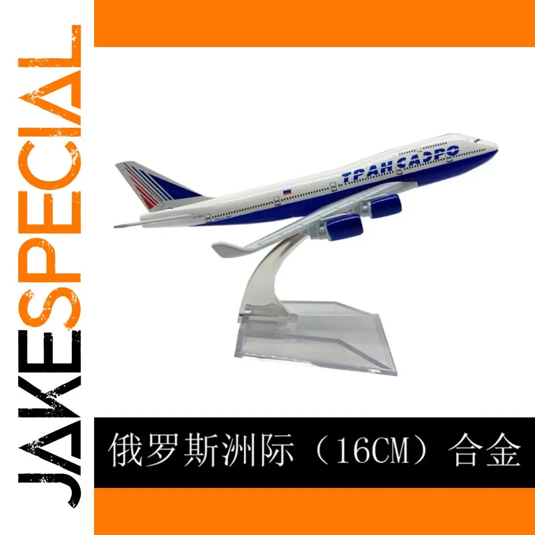 This 16cm diecast metal alloy model of a Transaero Airways B747 in 1/400 scale showcases a sleek, modern design with a white fuselage accented by bold blue details and a tail fin featuring red, white, and blue diagonal stripes. Carefully crafted from metal and resin, it includes realistic landing gear and removable wings for assembly, all supported on a clear display stand that accentuates its elegant silhouette. Measuring approximately 16cm in length, this decorative aircraft model is perfect for collectors and home decor enthusiasts, offering a detailed and authentic representation of a large, contemporary jet for display purposes only.