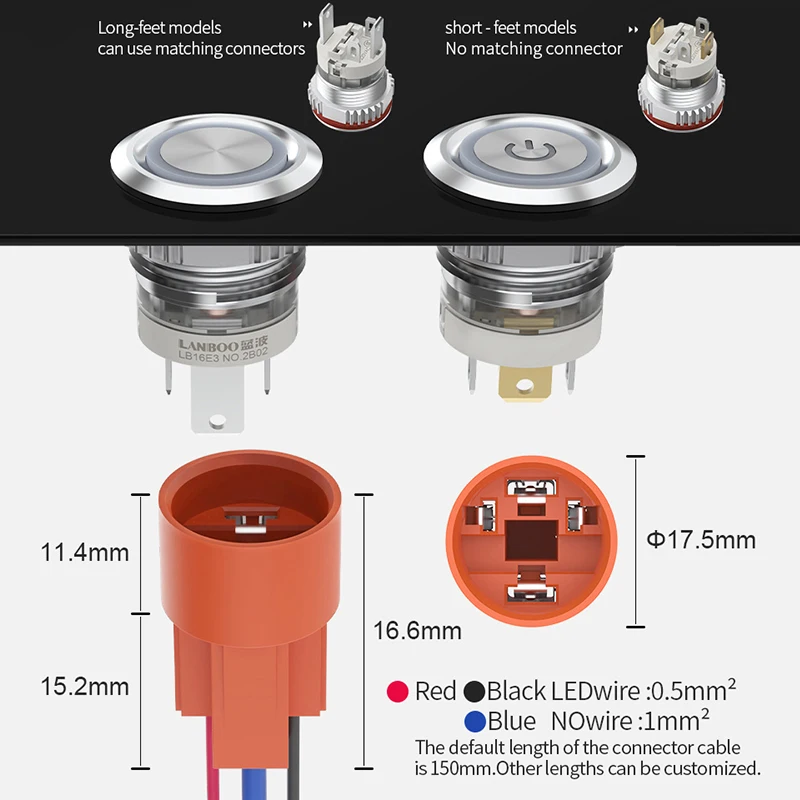 - This 16mm high-current switch supports a rated load of 16A at AC110V/220V and DC12V/24V, ideal for high-power applications requiring stable operation and long-term durability.