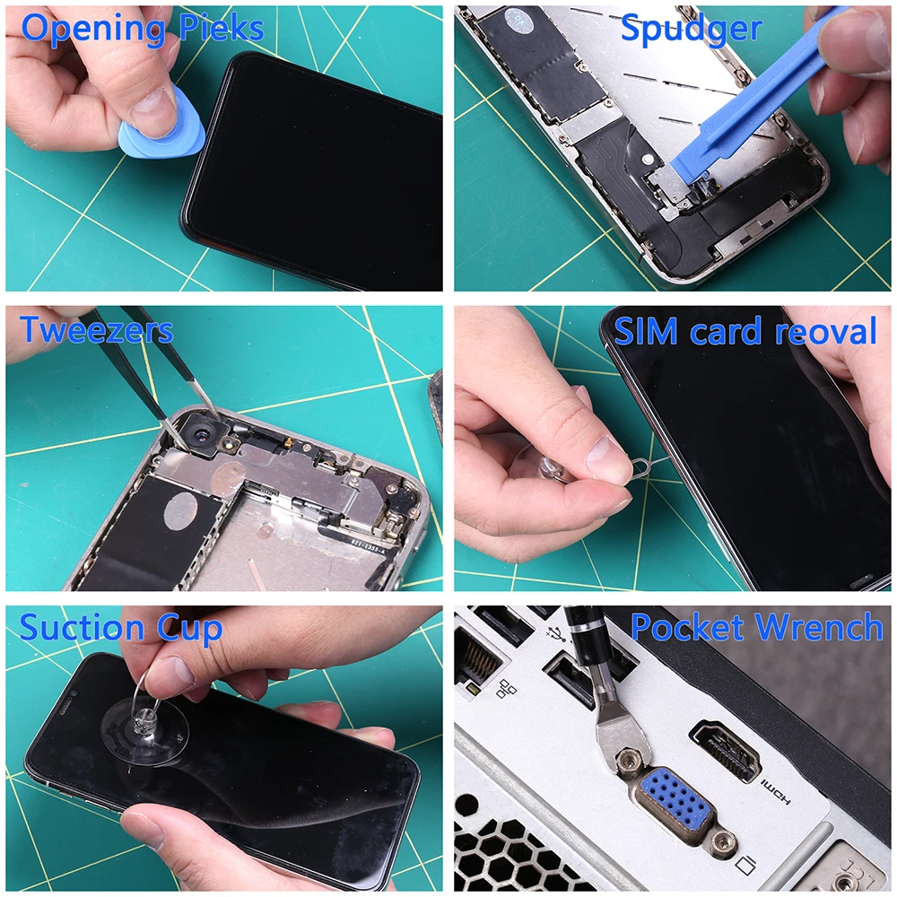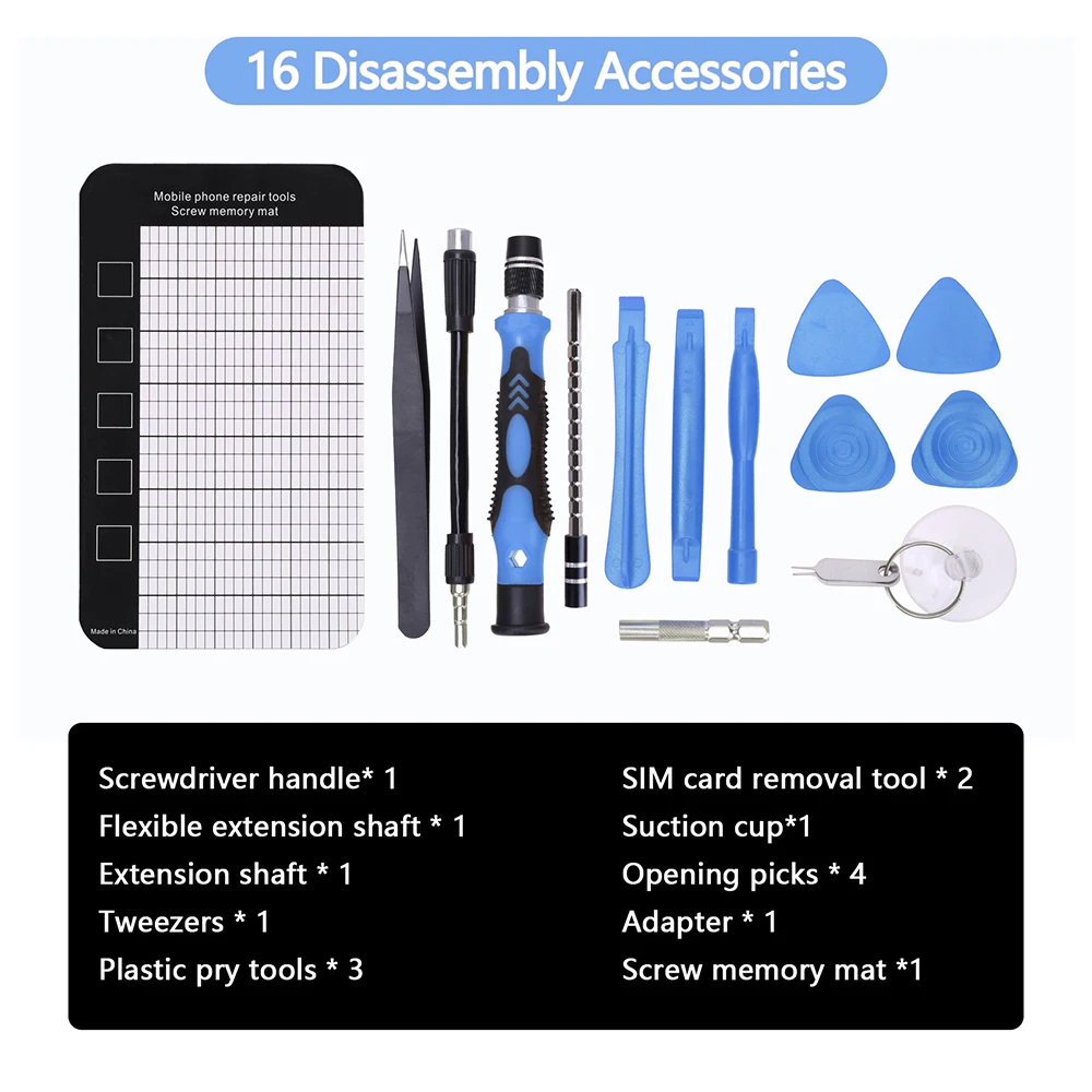 - The set includes 16 disassembly accessories such as tweezers, pry tools, suction cups, plastic opening picks, adapters, and a flexible screwdriver handle to access hard-to-reach screws safely.