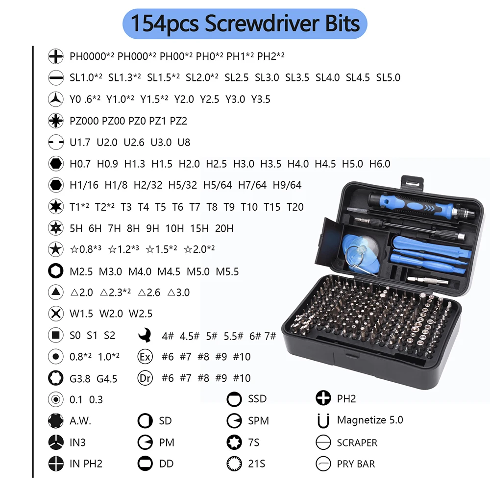 - 170 high-quality pieces including 154 screwdriver bits cover all major screw types like Phillips, Slotted, Tri-point, Pozidriv, T-shape, Hex, Torx, Pentagonal, and specialized shapes for versatility.