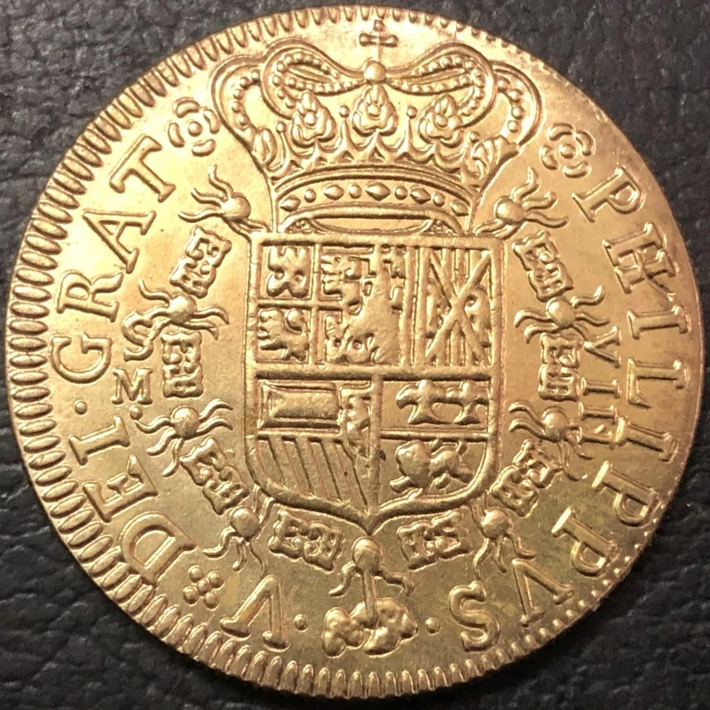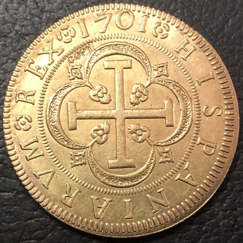 Experience the timeless charm of this intricately designed reproduction coin, inspired by the 1701 Spain 8 Escudos from the reign of Felipe V in Seville. Crafted with meticulous attention to detail, this gold-colored piece mimics the antique European coinage of the 18th century. Featuring a round shape with a textured, matte finish that evokes a weathered, aged appearance, it highlights engraved symbols like a prominent central cross, floral motifs at each end, and fine inscriptions. The polished raised elements contrast beautifully against the background, emphasizing craftsmanship and historical authenticity. Perfect for collectors or as a decorative accent, it brings a touch of elegance and vintage allure to any collection or display.