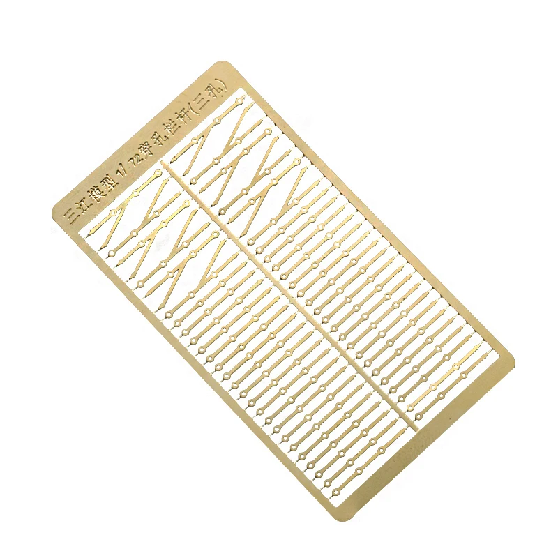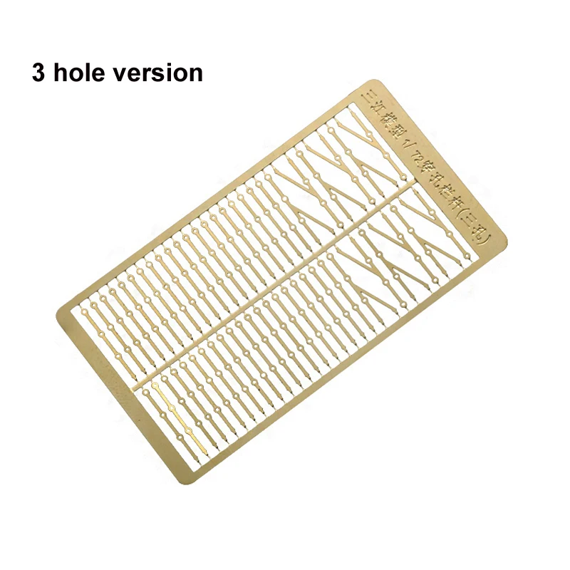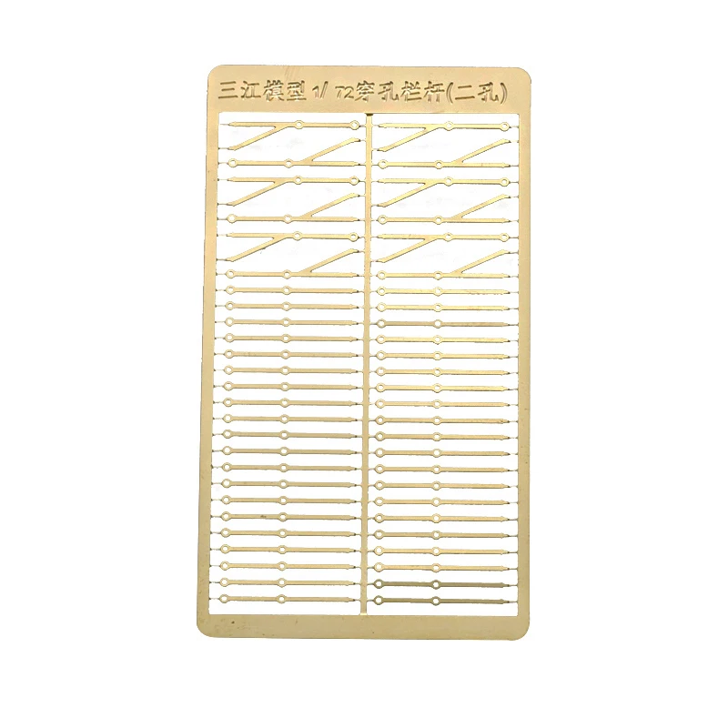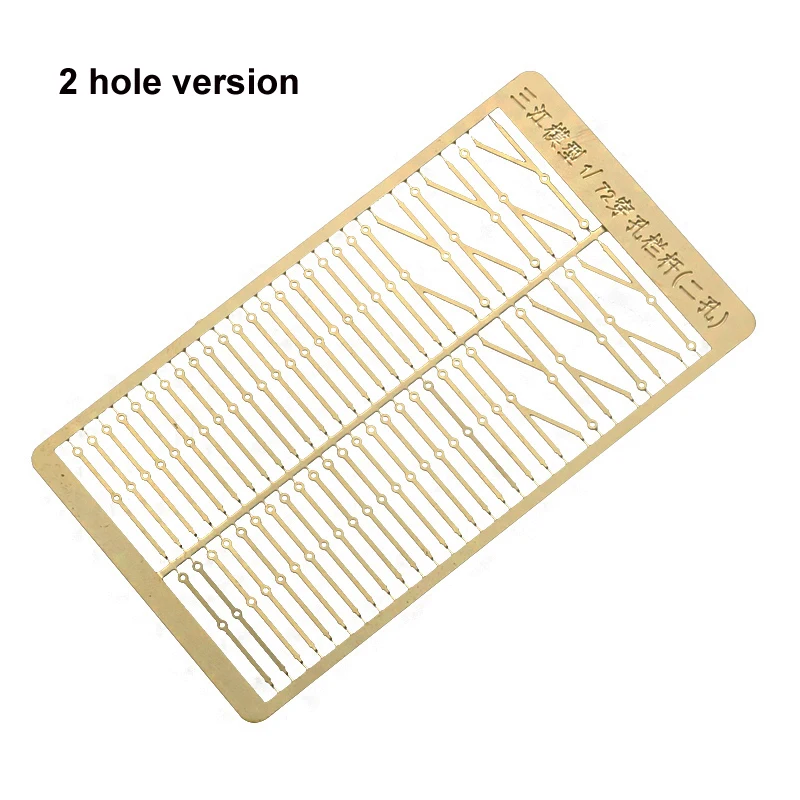 Imagine elevating your 1:72 scale model boat with these finely etched brass railing posts. Crafted with meticulous attention to detail, each sheet features delicate designs of slim, elongated posts with tiny circular and linear accents. Their smooth, metallic sheen highlights the expert etching process, ensuring durability and authenticity. The set includes both 2-hole and 3-hole versions, allowing you to customize your model’s railing system. With each post measuring 15mm in height and just 0.4mm thick, they blend seamlessly into your project, adding a realistic and sophisticated touch. Easy to assemble, these components are perfect for passionate hobbyists seeking precise craftsmanship for their ship models.