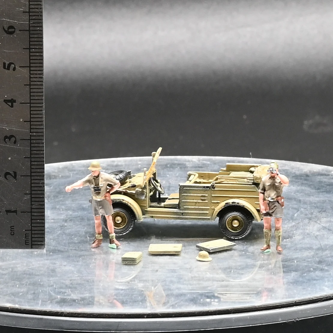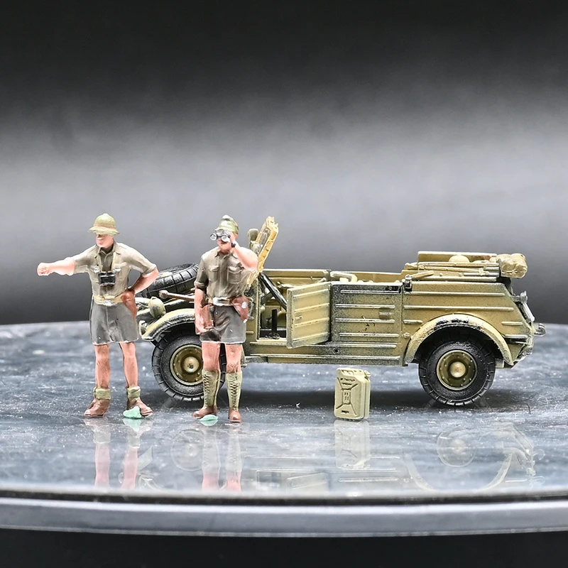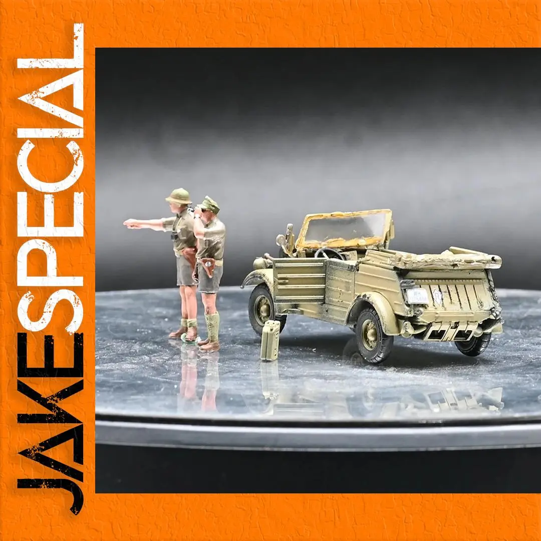 This meticulously crafted 1:72 scale finished model set includes a German car and two soldier figures representing the African Legion. The German car features a weathered beige and olive drab color scheme with an open-top design, detailed steering wheel, black wheels with silver rims, and a rectangular license plate. The two resin soldier figures, standing approximately 3 cm tall, are articulated: one commands with a forward gesture, while the other observes through binoculars, both adorned in military attire featuring green and beige tones. This set is perfect for enhancing military sand table scenario displays, creating a striking visual of historical significance.