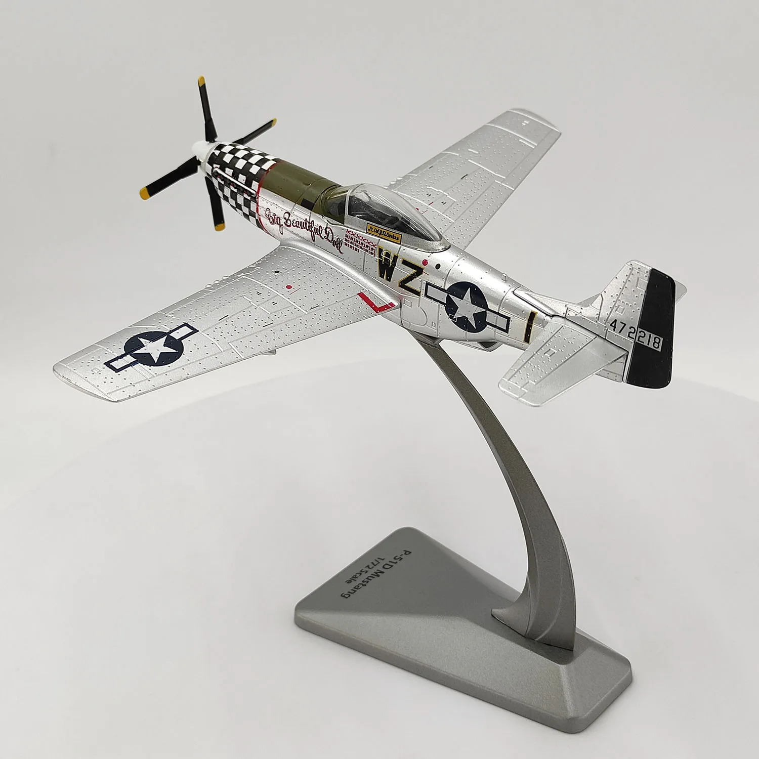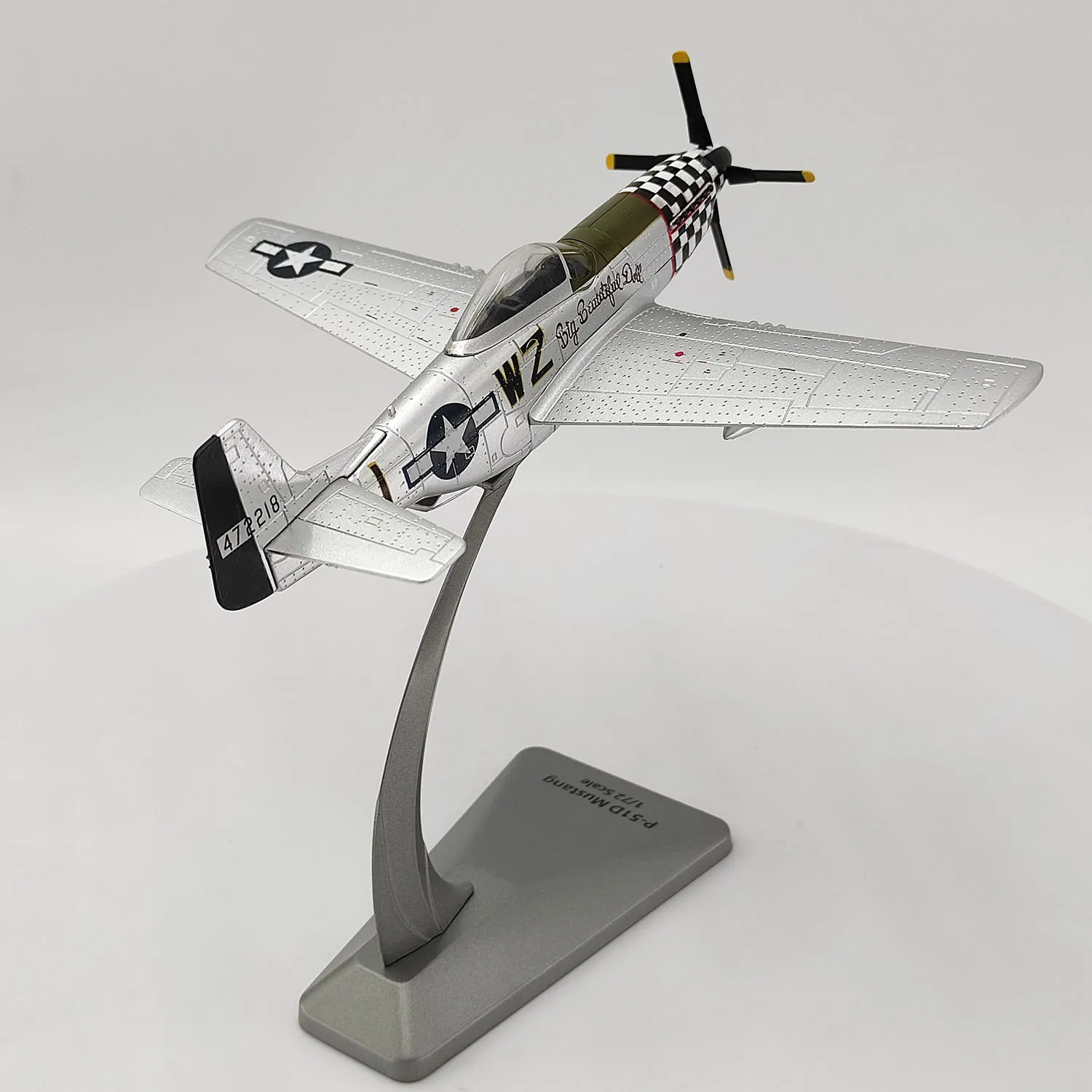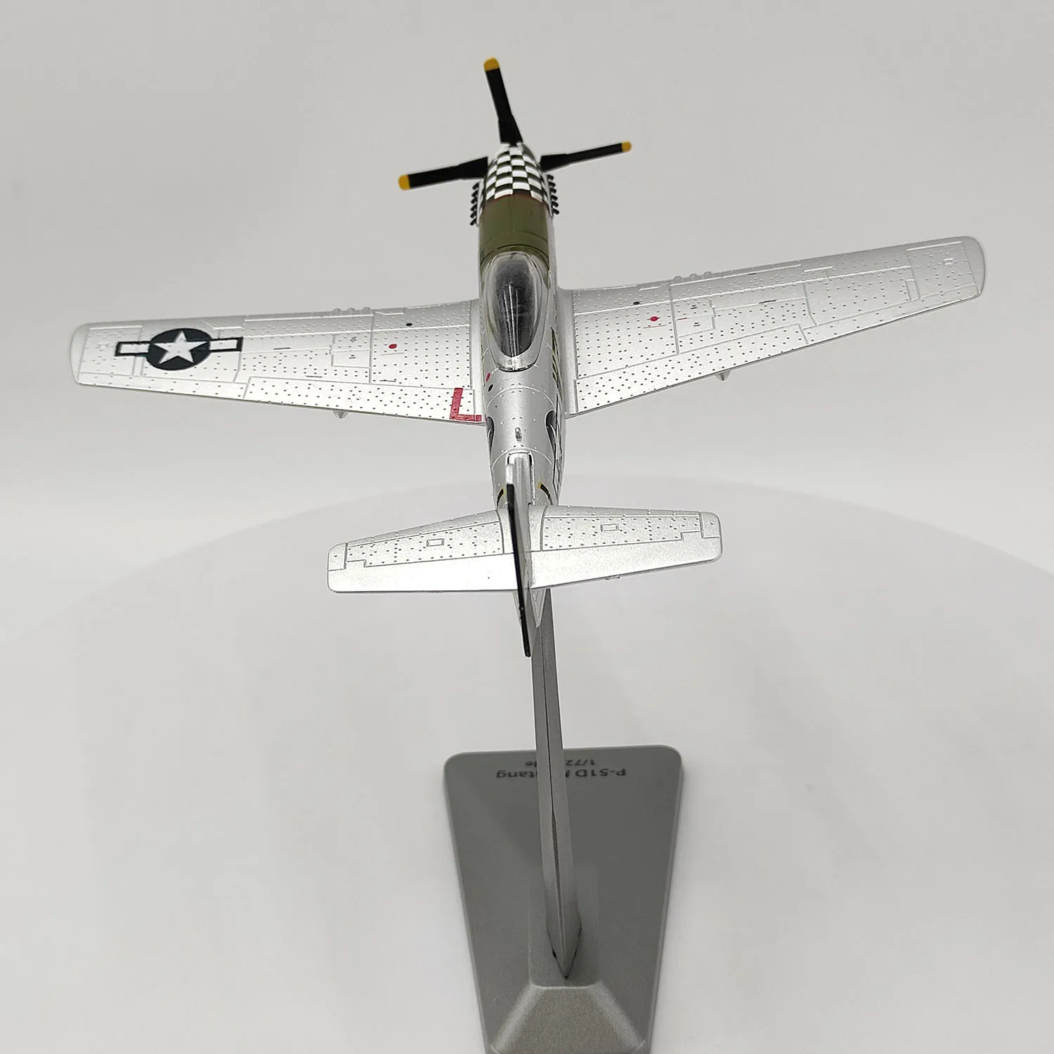 Experience the timeless appeal of this meticulously crafted diecast alloy model of the legendary P-51D Mustang fighter aircraft. Designed on a 1:72 scale, this collectible showcases a polished metallic silver fuselage with precise painted details, including navy blue insignias, white stars, and red accents that highlight its vintage military style. The nose features a black and white checkered pattern, paired with a small yellow and black striped propeller, adding vibrancy and authenticity. The transparent canopy reveals intricate interior details, while surface features like panel lines and rivets enhance realism. Perfect for display, this model elevates any collection with its refined craftsmanship and striking aesthetics.