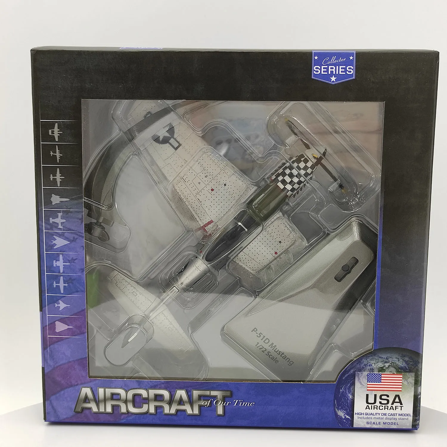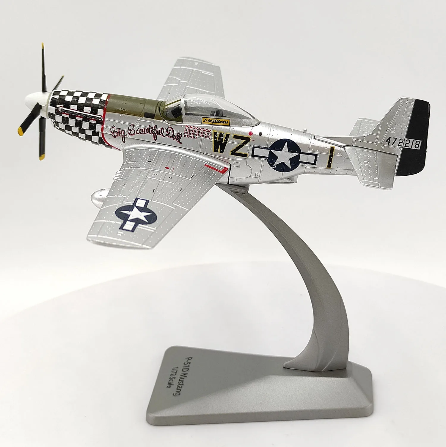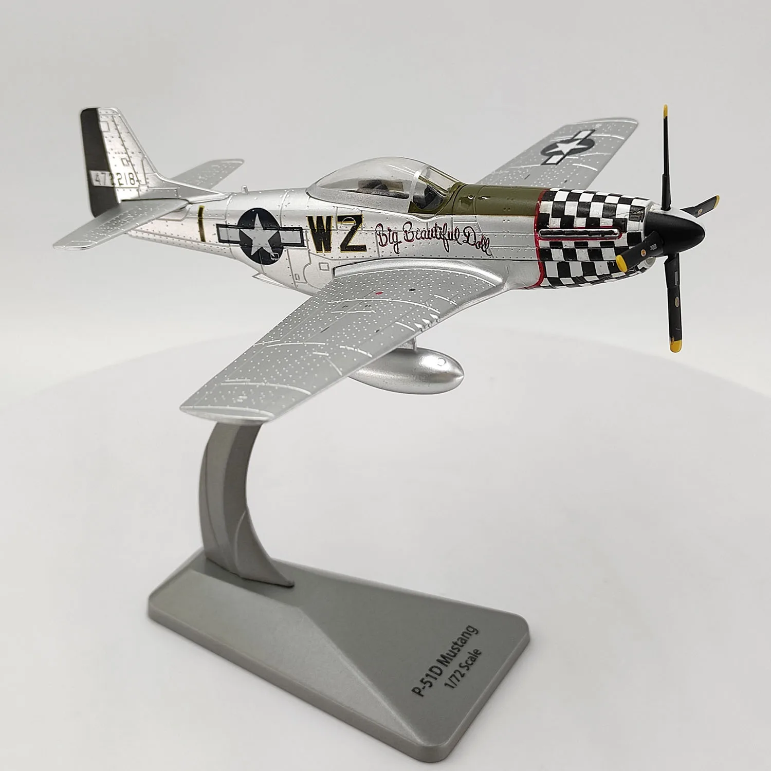 Experience the timeless appeal of this meticulously crafted diecast alloy model of the legendary P-51D Mustang fighter aircraft. Designed on a 1:72 scale, this collectible showcases a polished metallic silver fuselage with precise painted details, including navy blue insignias, white stars, and red accents that highlight its vintage military style. The nose features a black and white checkered pattern, paired with a small yellow and black striped propeller, adding vibrancy and authenticity. The transparent canopy reveals intricate interior details, while surface features like panel lines and rivets enhance realism. Perfect for display, this model elevates any collection with its refined craftsmanship and striking aesthetics.
