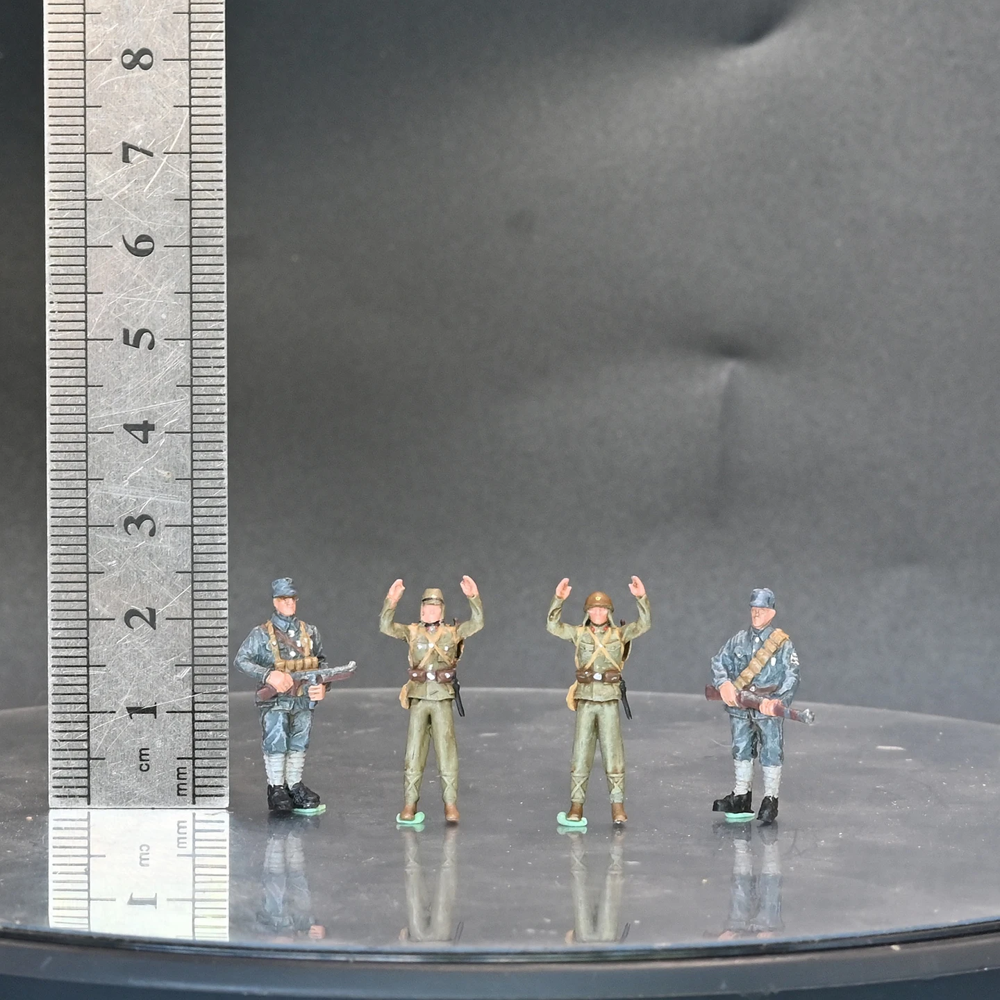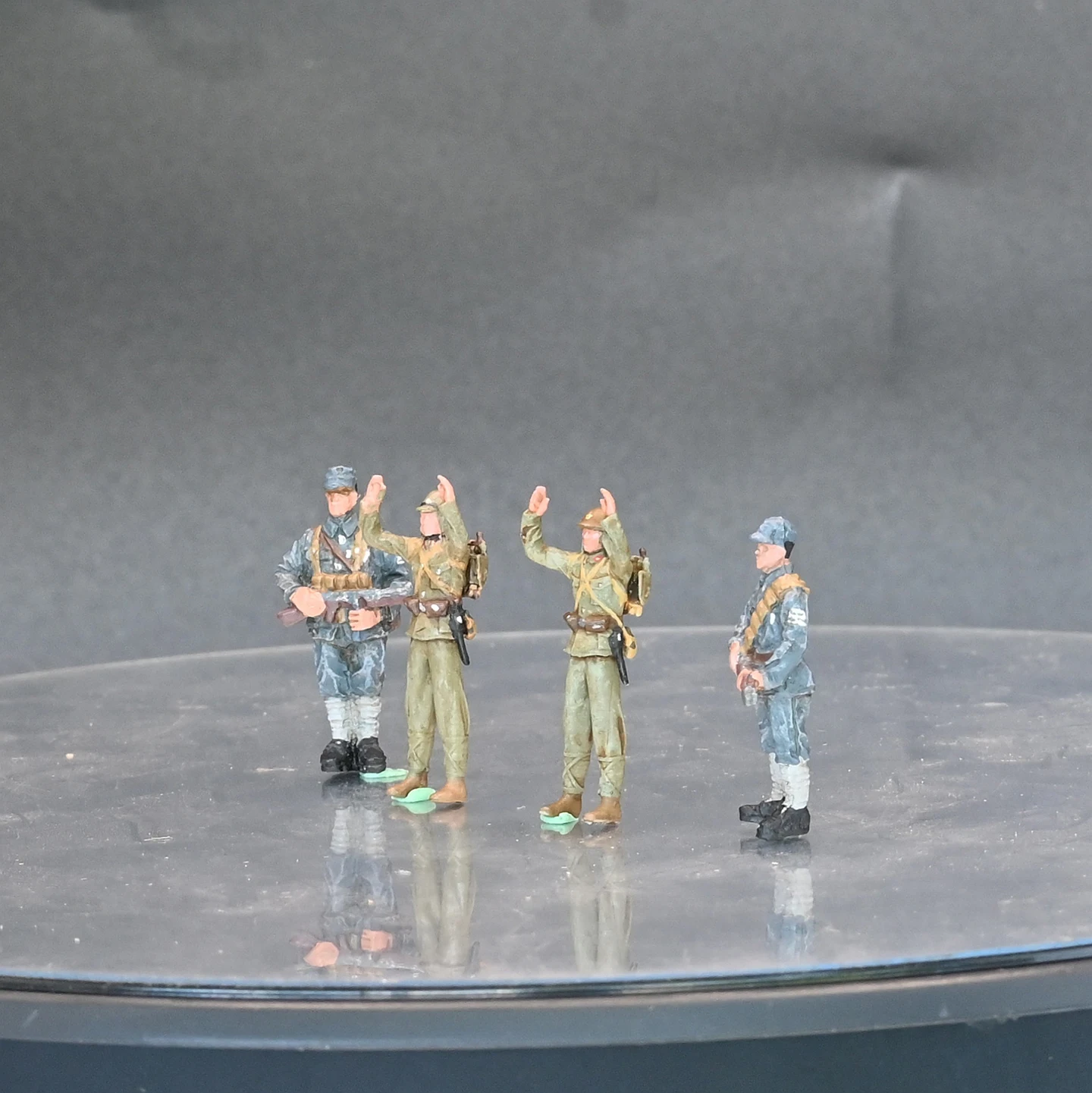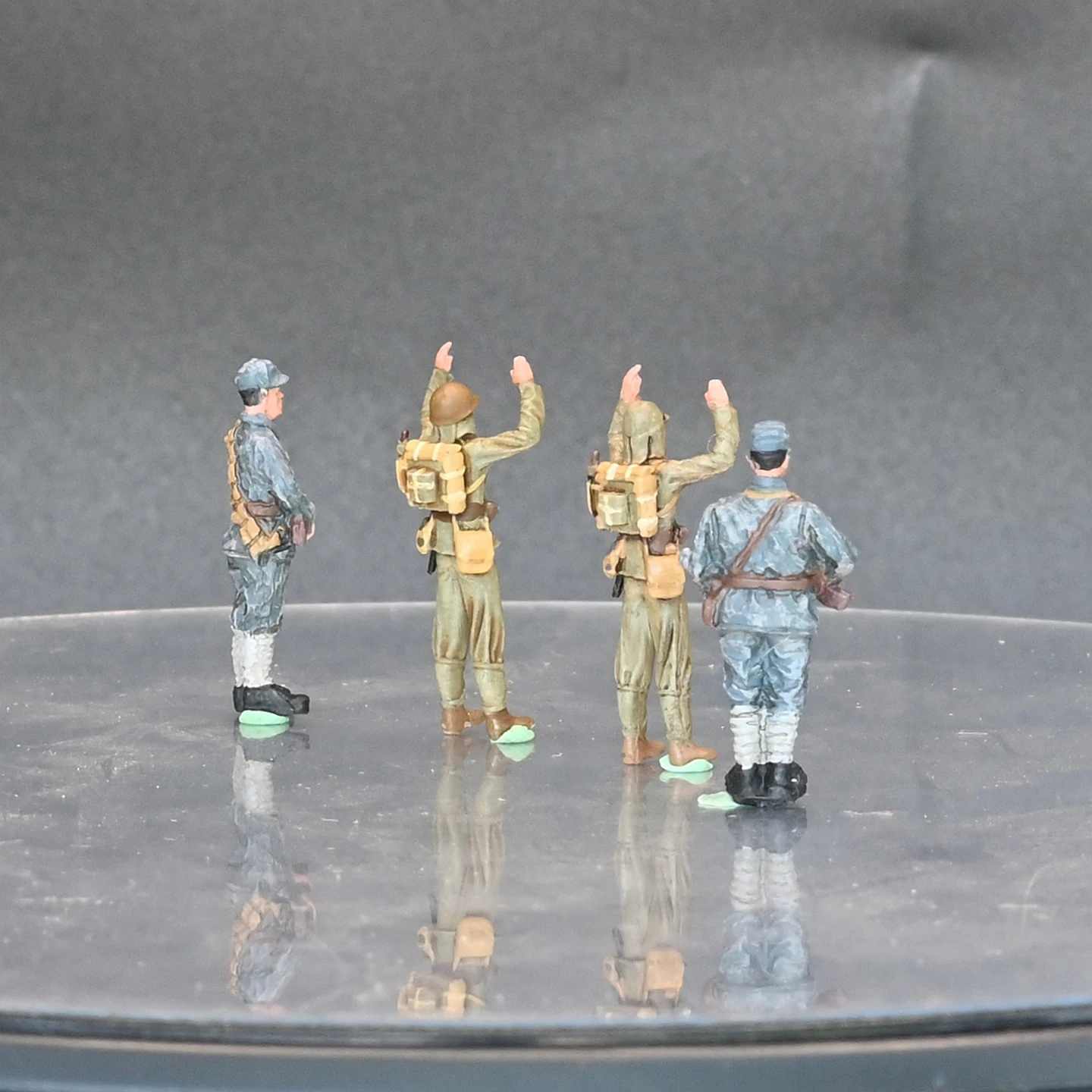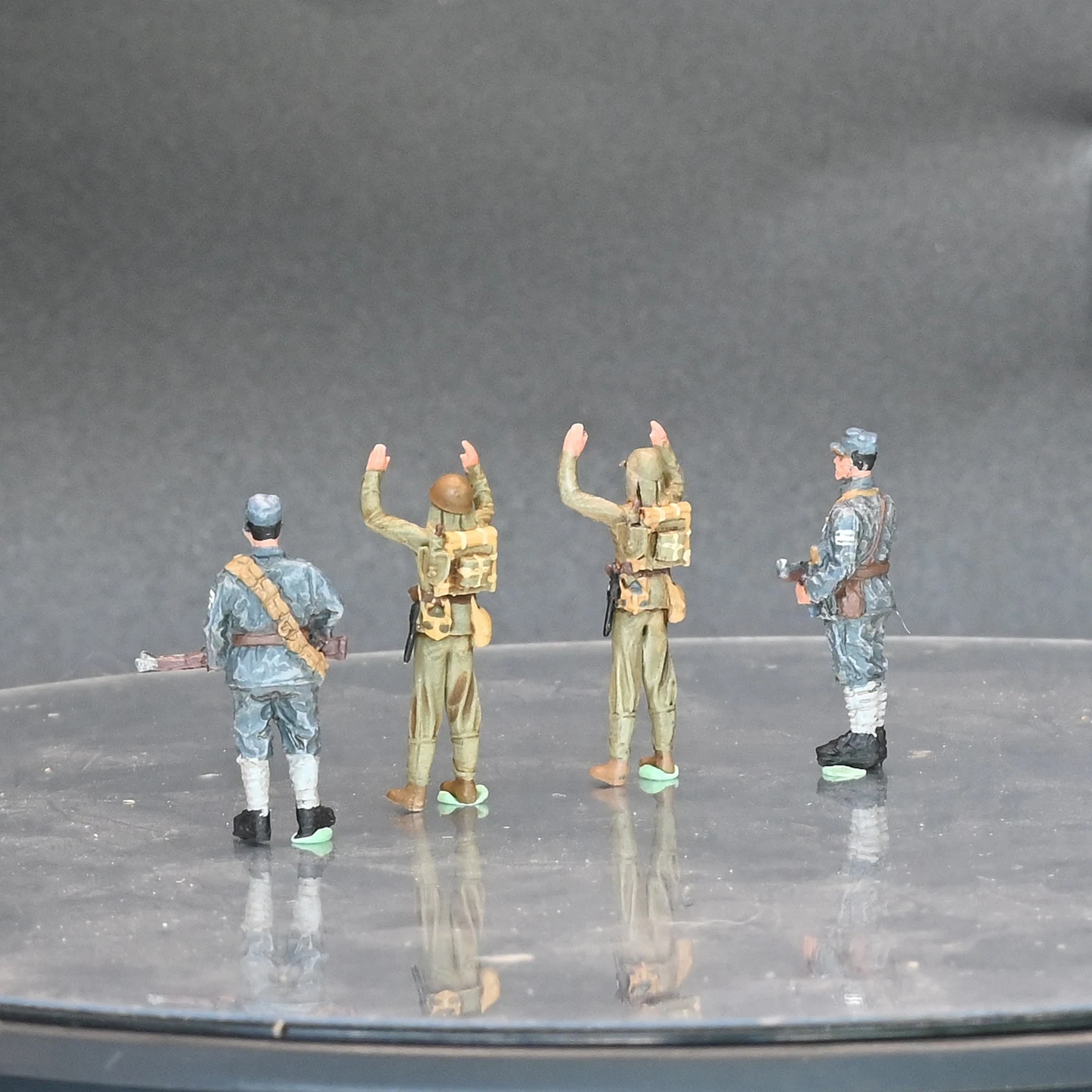 Immerse yourself in this detailed 1:72 scale resin model, showcasing four figurines captured in a poignant scene. The figures include two soldiers dressed in gray and blue uniforms with rifles, belts, pouches, and helmets, radiating authenticity. Alongside are two prisoners in muted yellowish-green uniforms, blindfolded with their hands raised, depicting a compelling moment of captivity. The paintwork emphasizes subtle shading and highlighting, bringing out intricate details and realistic postures. Crafted with precision, this scene makes a perfect addition to any diorama, collection, or nostalgic display. Its durable resin construction ensures longevity, allowing you to relive historical moments through this striking miniature scene. Ideal for serious collectors and history enthusiasts alike.